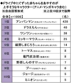 また、ドライブ中にぐずった赤ちゃんをあやすのが上手そうなキャラクター(アニメ・マンガキャラ含む)を聞いたところ、「アンパンマン(それいけ!アンパンマン)」(428名)がダントツとなり、2位「ドラえもん(ドラえもん)」(40名)、3位「ワンワン(いないいないばあっ!)」(38名)、4位「ミッキーマウス(ミッキーマウス!)」(25名)、5位「縞野しまじろう(しましまとらのしまじろう)」(14名)と続きました。
