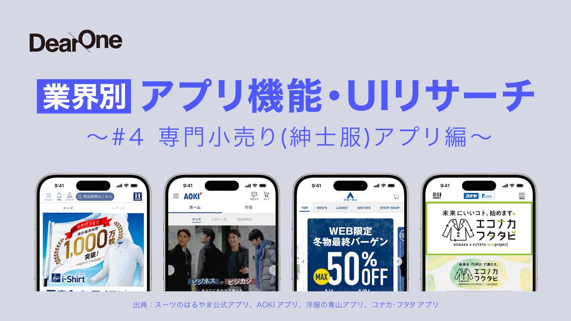 株式会社NTTドコモのマーケティング分野における新規事業型子会社である株式会社DearOne(本社:東京都港区、代表取締役:河野 恭久、以下:DearOne)は、アプリ開発会社の観点から、他社アプリのUI/UX、機能のレビューをコンセプトとした「業界別 アプリ機能・UIリサーチ~#4 専門小売り(紳士服)アプリ編〜」を公開いたしました。
