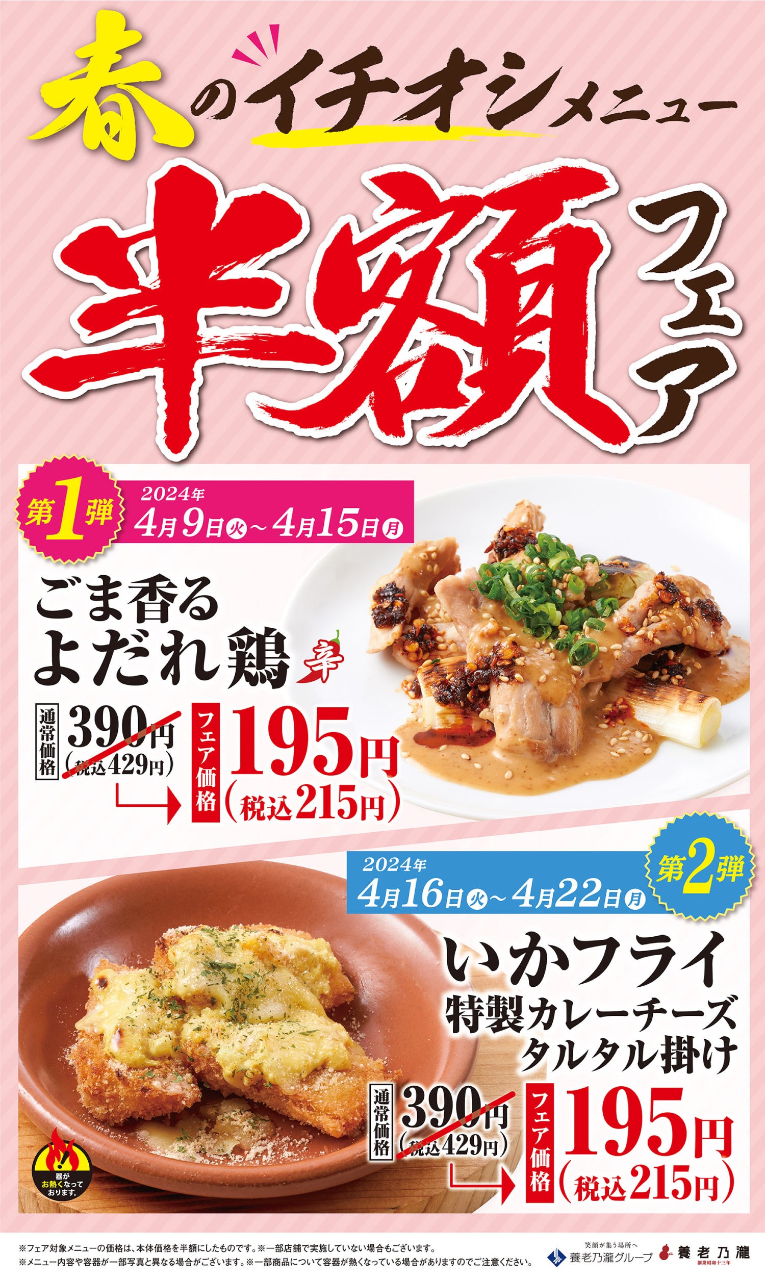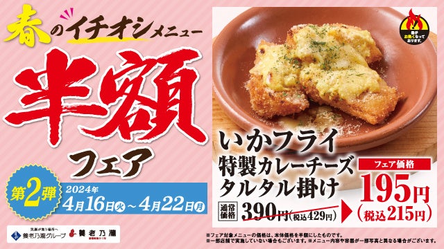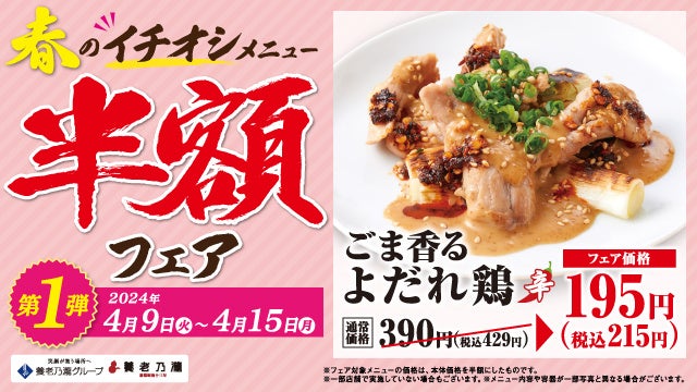 4月9日(火)新メニュー登場!対象のイチオシのメニューを半額で販売!第1弾:2024年4月9日(火)~ 4月15日(月) / 第2弾:2024年4月16日(火)~ 4月22日(月)
