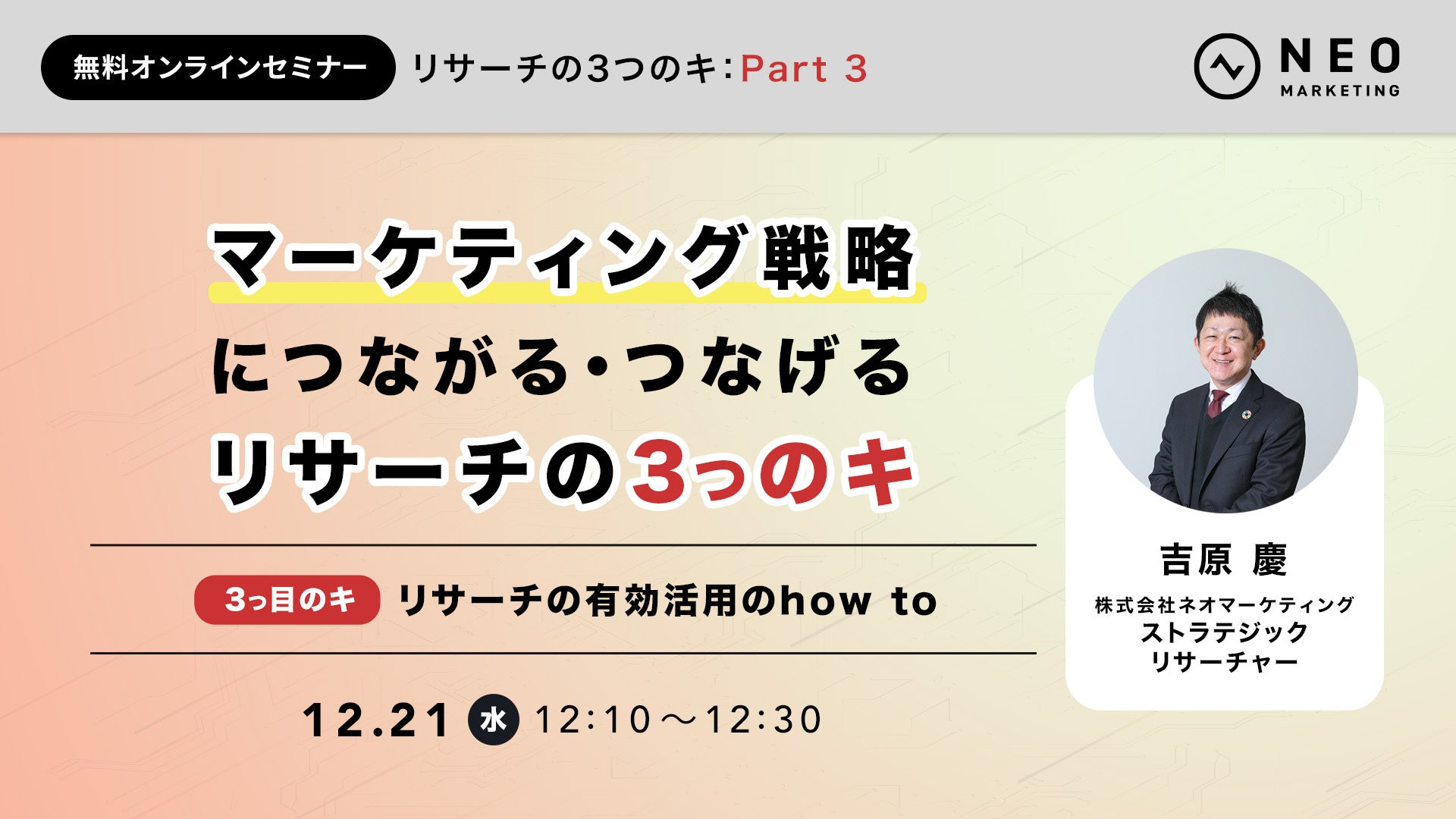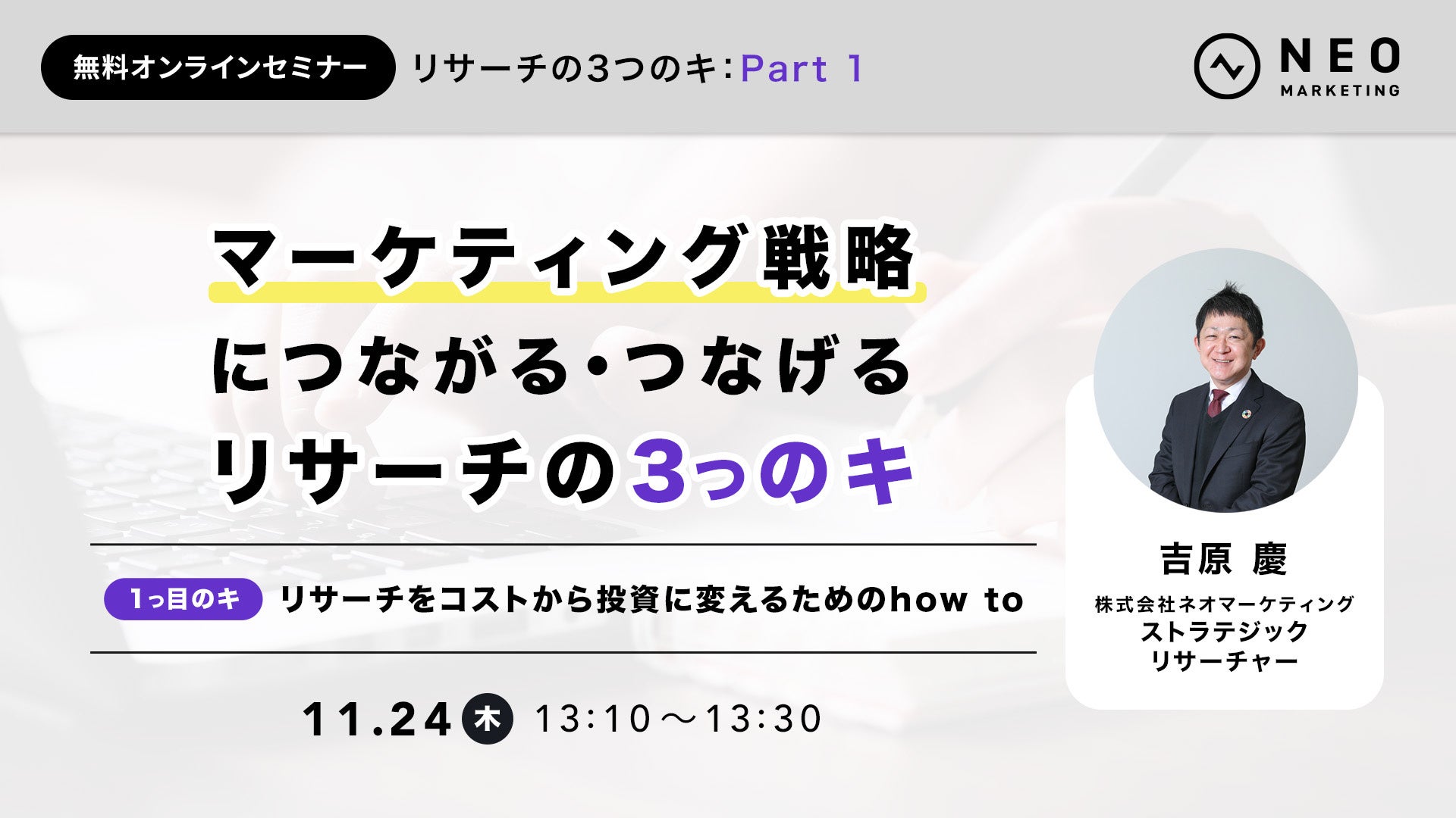 【ストラテジックリサーチャーによる無料ウェビナーのお知らせ マーケティング戦略につながる・つなげるリサーチの3つのキ】株式会社ネオマーケティング