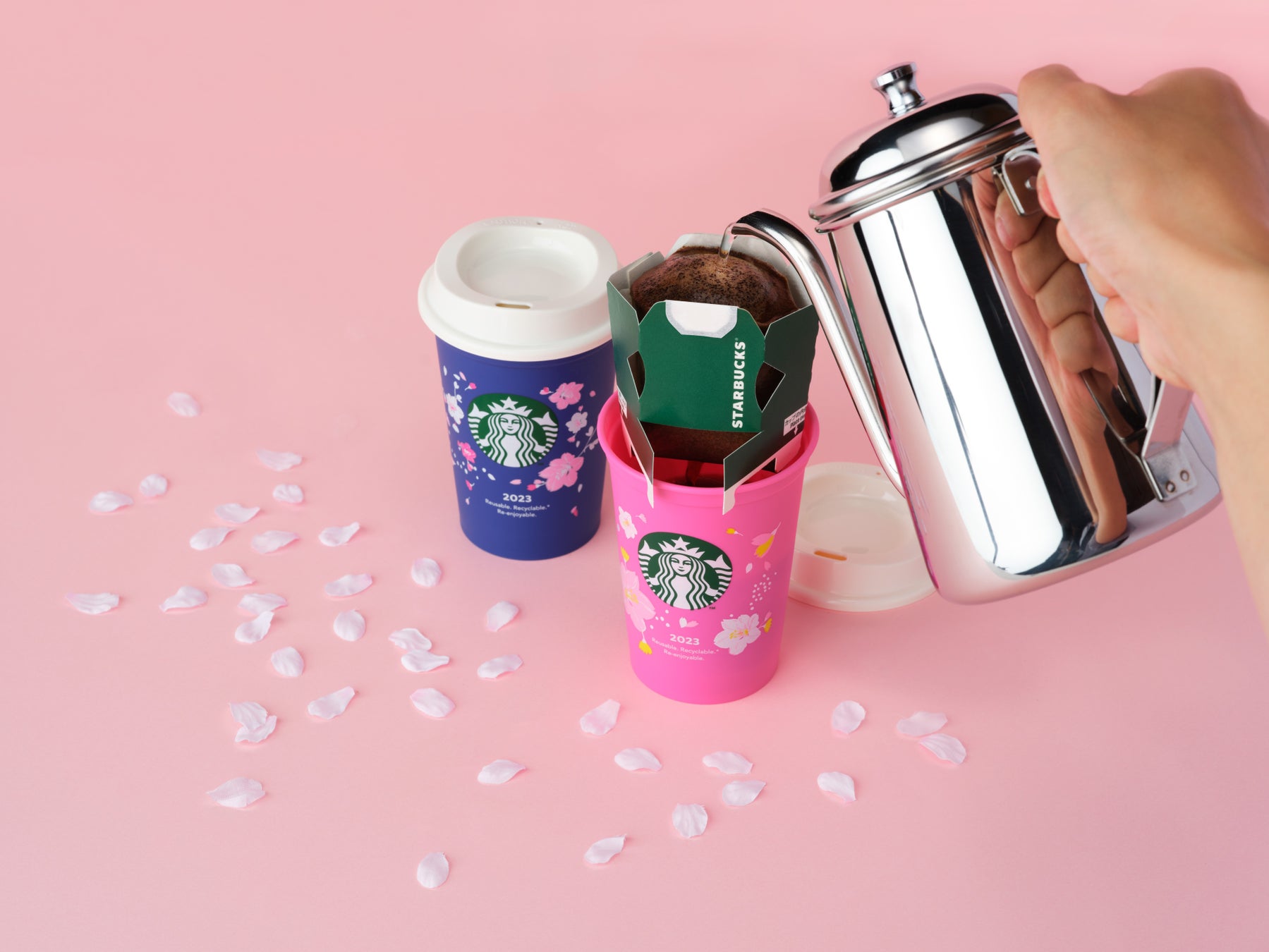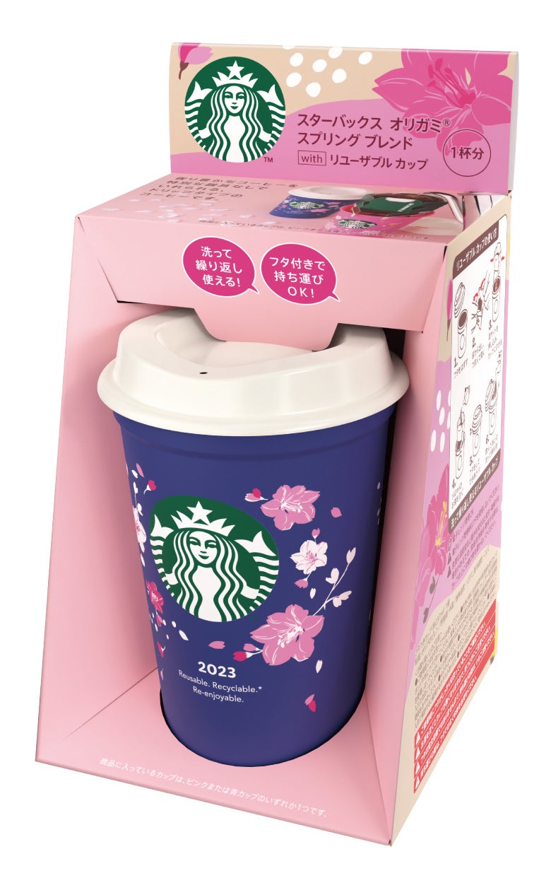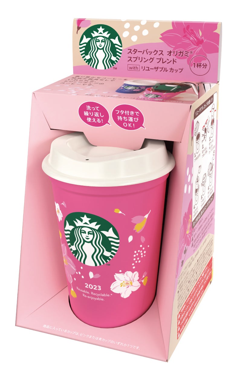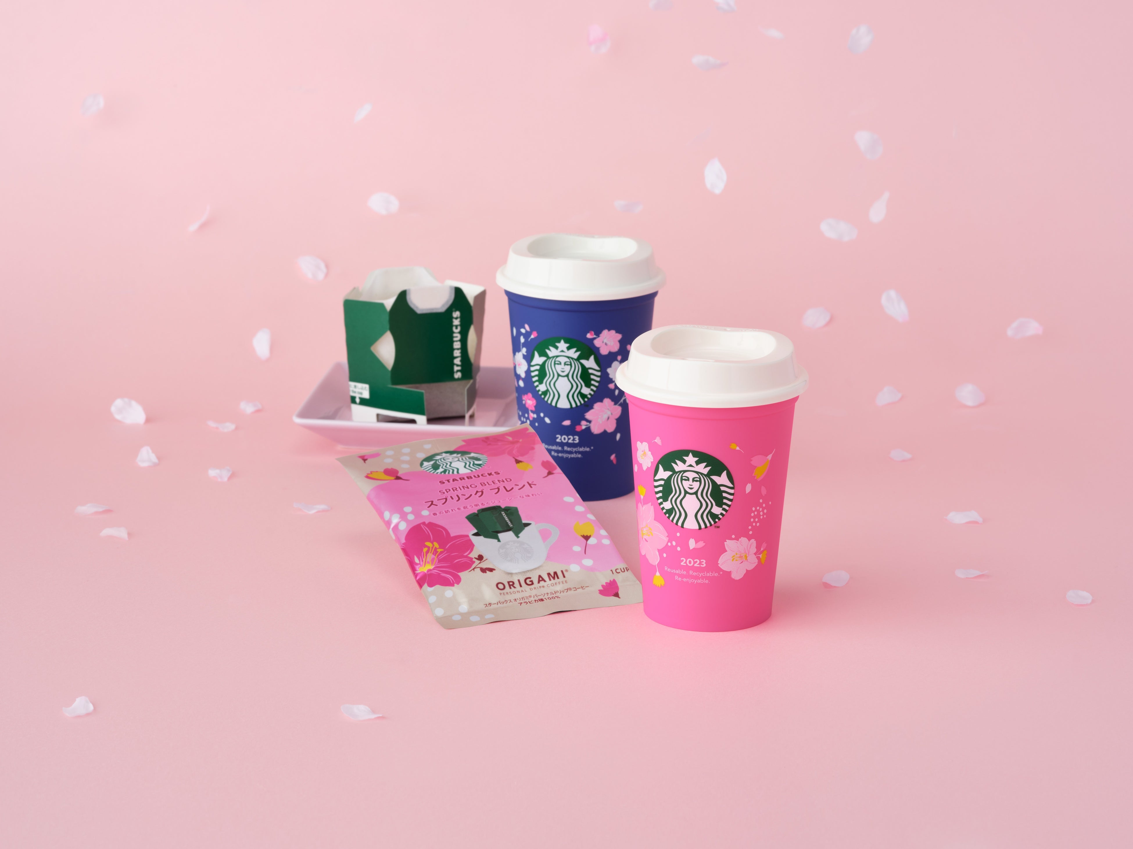 2023年は3年ぶりにパッケージデザインを一新し、春の訪れを祝う、満開の桜の花びらが特徴のデザインとなりました。自宅やオフィスで手軽に楽しめる家庭用製品として「スターバックス オリガミ® パーソナルドリップ® コーヒー」「レギュラーコーヒー(粉)」の2タイプを発売するとともに、「スターバックス オリガミ® パーソナルドリップ® コーヒー スターバックス® スプリング ブレンド」1袋と「リユーザブル カップ」がセットになった製品も発売します。