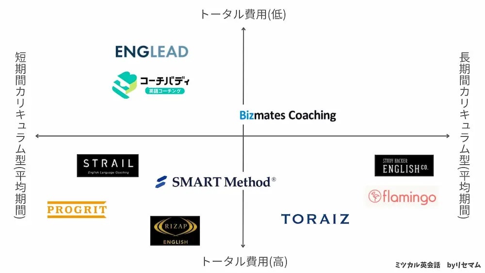 英語コーチングを選ぶ際に重要視される以下の2軸で分類したポジショニングマップです。