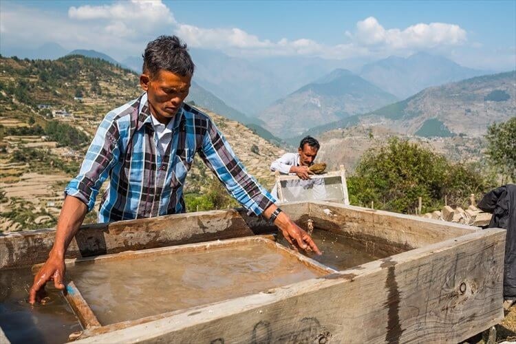 手漉き紙というのは、ヒマラヤの高地に生息する植物「ロクタ」の樹皮を原料に作られている「ロクタ紙」のことです。約1000年前に発明され、当時からほとんど変わらない手法と材料によって、現在でも一枚一枚職人の手作業によって生産されています。