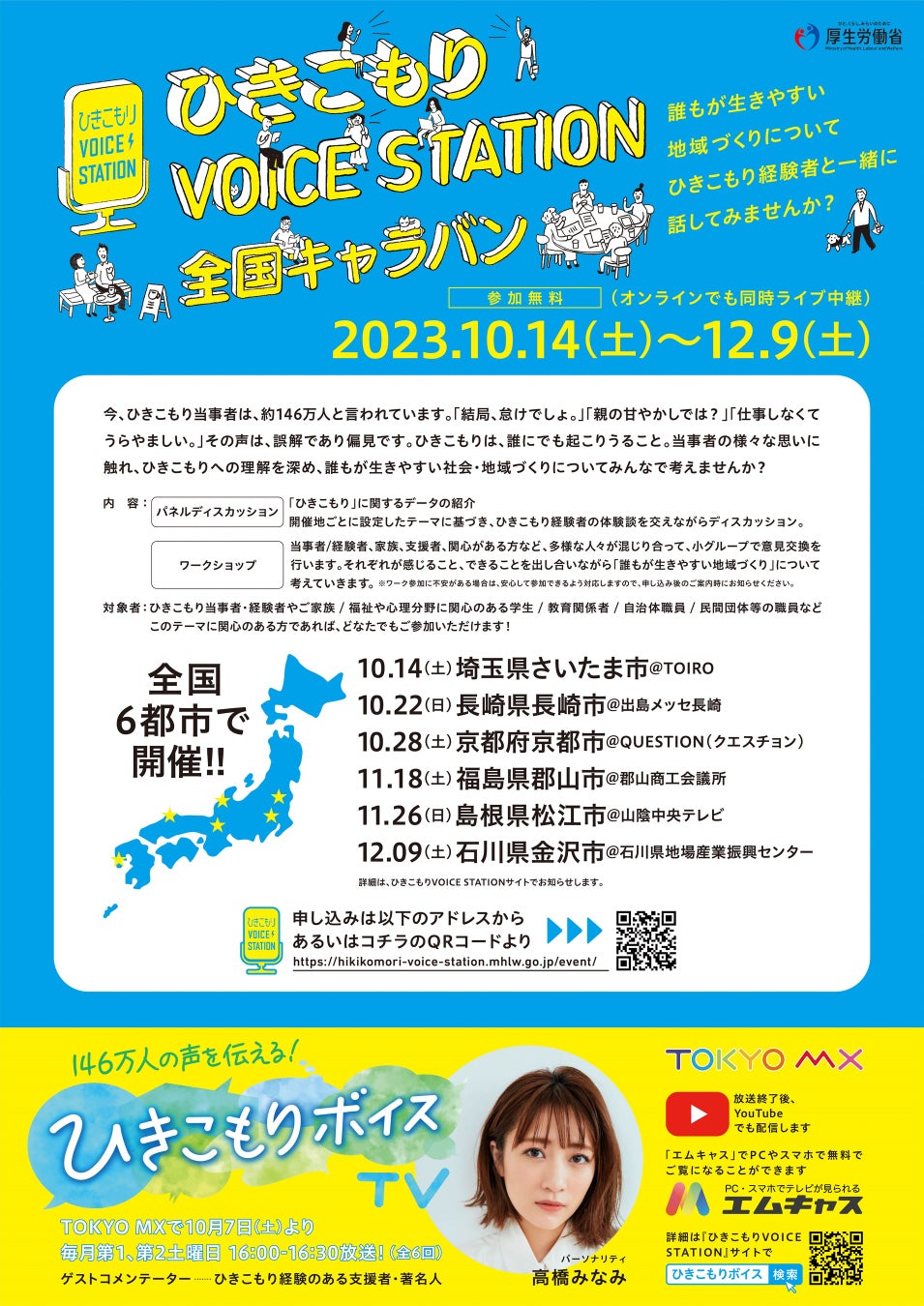 ひきこもりvoice station全国キャラバンは、厚生労働省が主催し、当事者や家族会、大学など知見を有する企画委員の参加により開催されます。10月14日(土)から12月9日(土)にかけて、埼玉、長崎、京都、福島、島根、石川の6都市でひきこもり状態にある人たちへの理解を広めていきます。