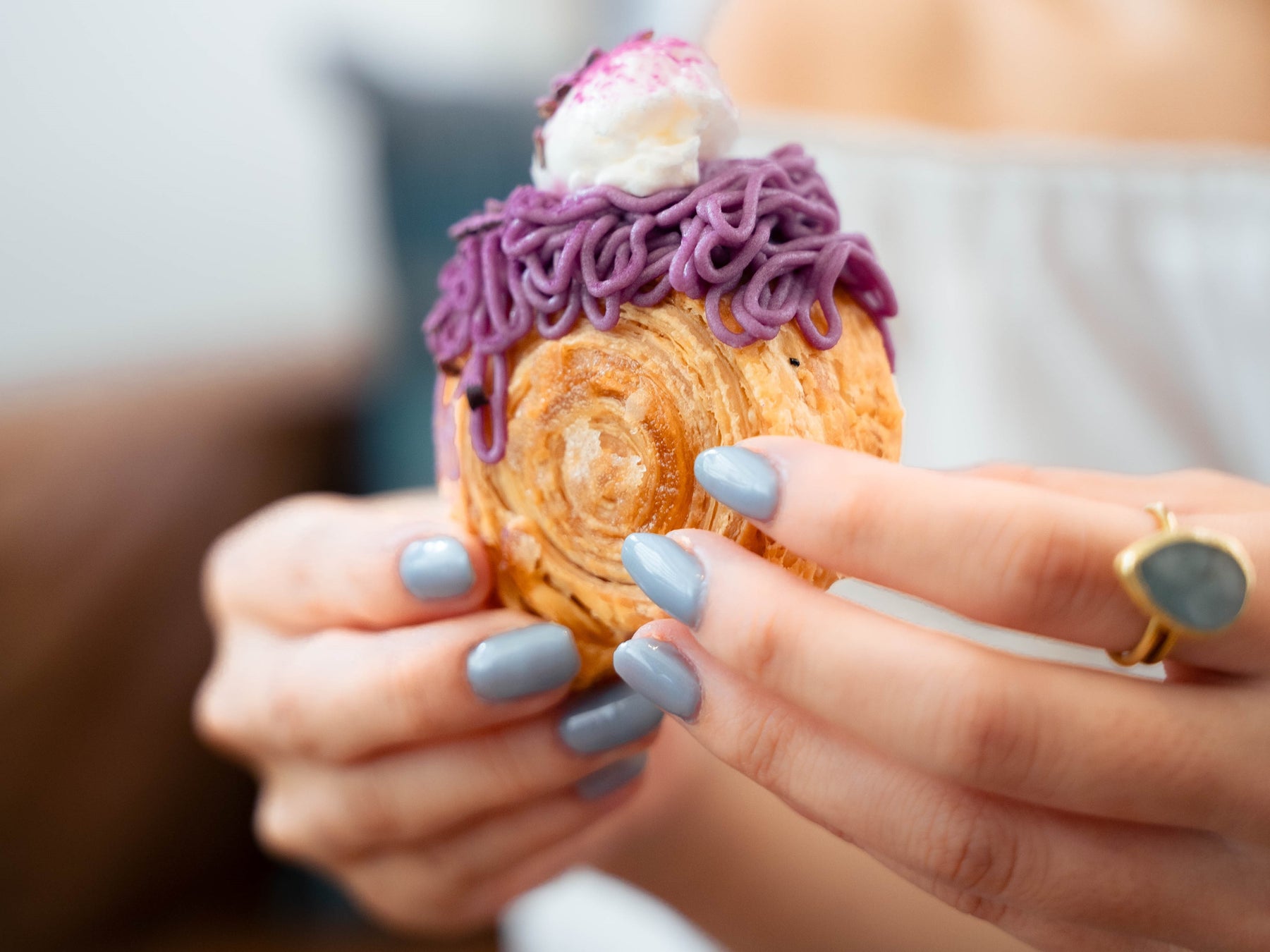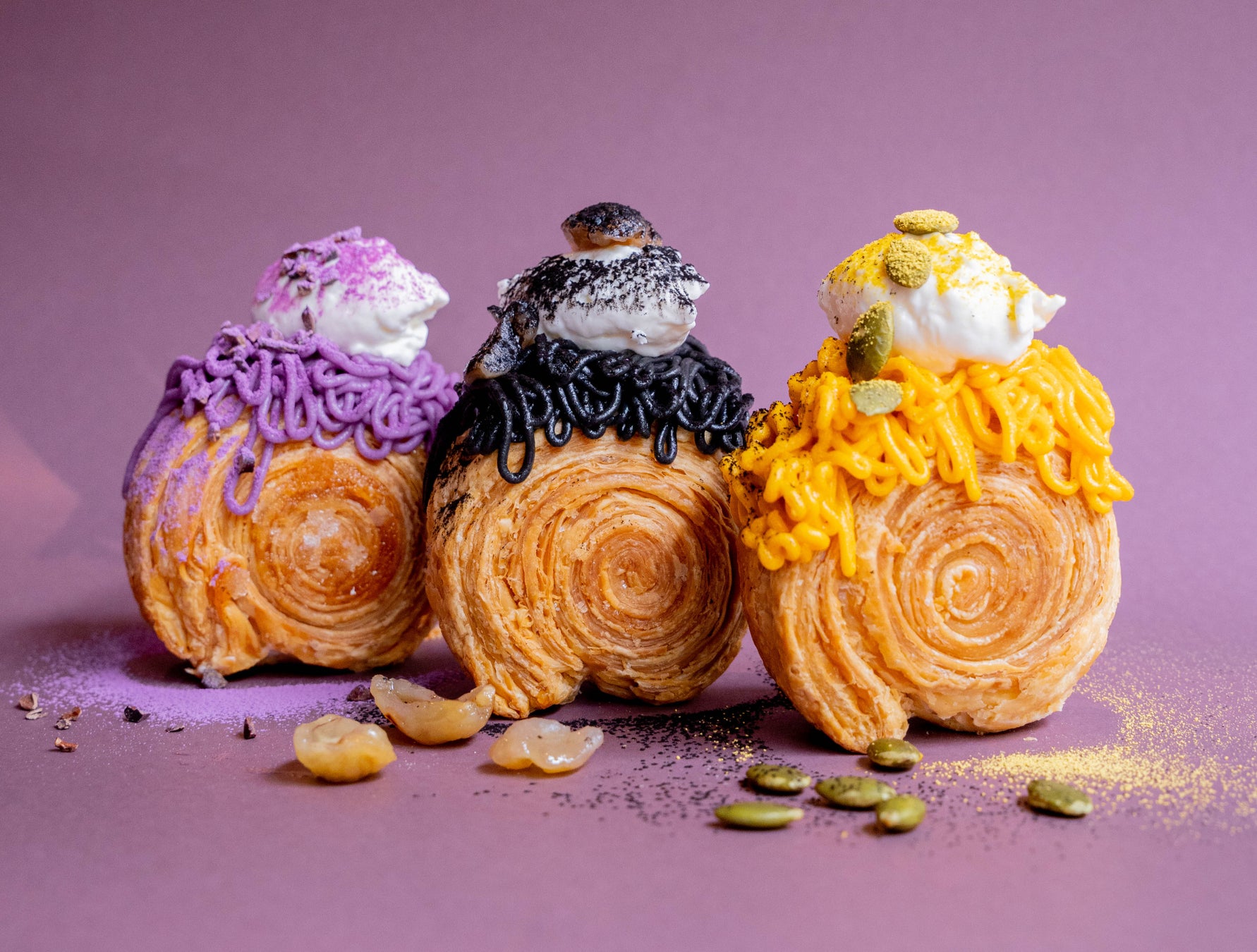 この秋は、ニューヨーク発祥の今話題の進化系クロワッサン「シュプリームクロワッサン」と秋の定番スイーツ「モンブラン」を掛け合わせたオリジナルスイーツ3種をご用意。一般的なシュプリームクロワッサンとは異なり、クロワッサン生地をフレンチの要素を取り入れミルフィーユで仕上げることで、何層にも重なったパイの層を感じるサクサクとした歯ざわりになり、クロワッサンでありながらもさらにスイーツらしさを楽しむことができます。他にもフレンチシェフならではのこだわりの、中にぎっしり詰まったバニラとラム酒風味のカスタードクリームと、トッピングされた酸味のあるフロマージュブランのチーズクリームの組み合わせからなる大人の味も魅力。また、栗・紫芋・かぼちゃのモンブランクリームで秋の和の味覚を表現しており、季節感を味わうこともできます。
