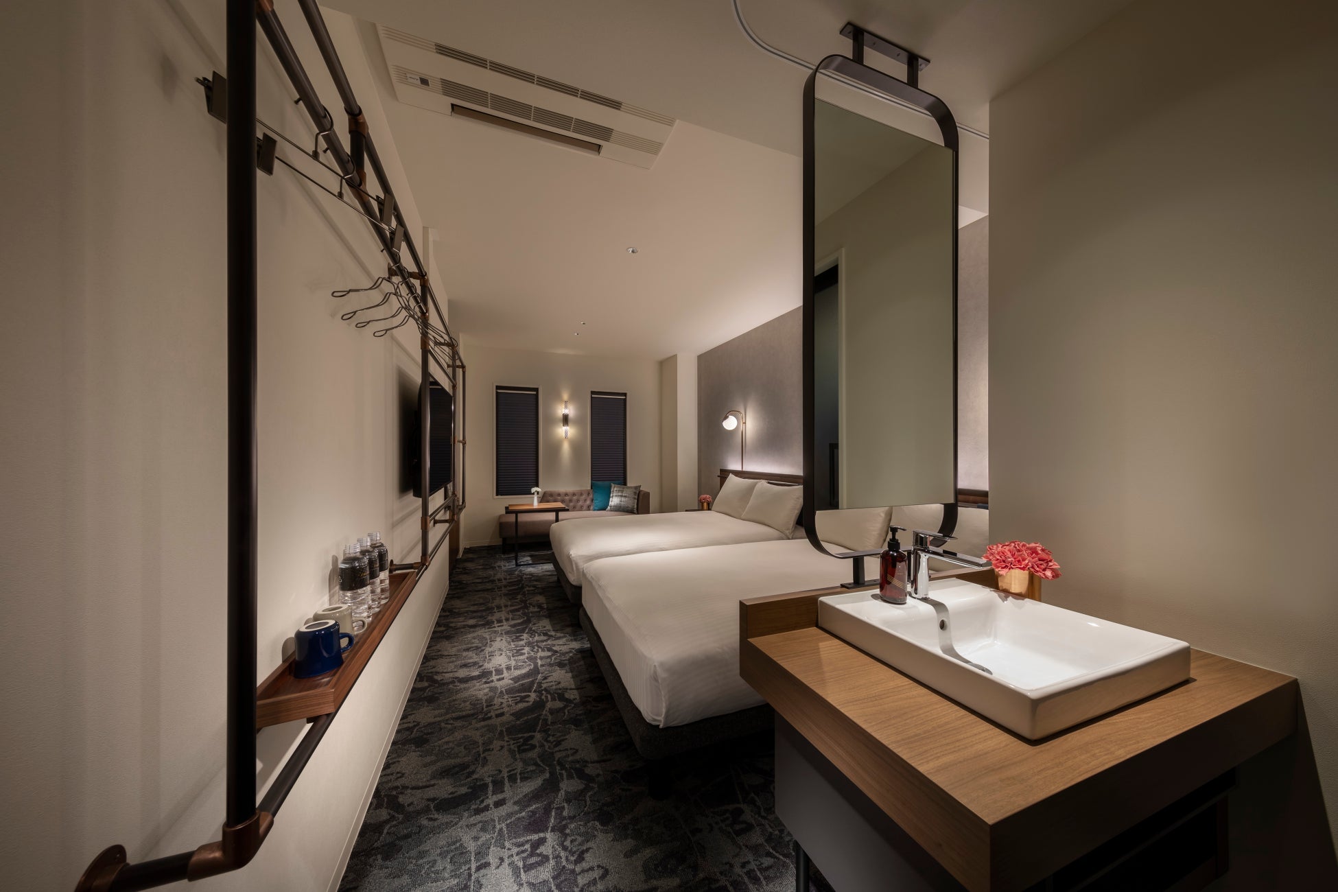 ツインルームは、24平米の空間に120センチのセミダブルベッド2台を備えたツインルームはご家族やご友人との集いに適した客室です。ソファスペースも十分に取られており、カフェタイムやお部屋で大切な時間をゆったりとお過ごしいただけます。この秋は、THE LIVLEY 大阪本町の他のホテルにはないユニークなデザインの客室で大切な人と一緒に思い出を作りませんか?