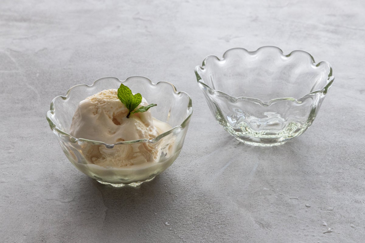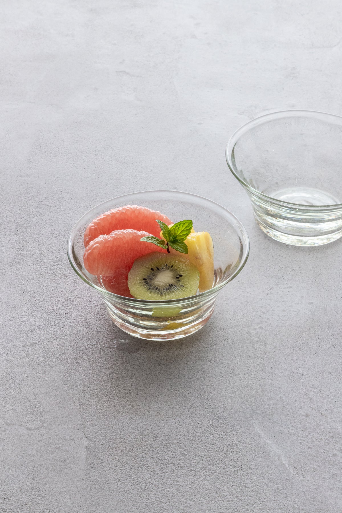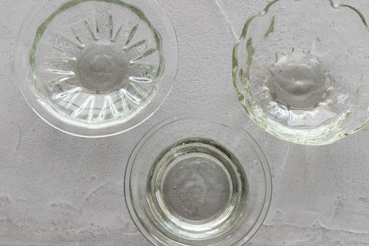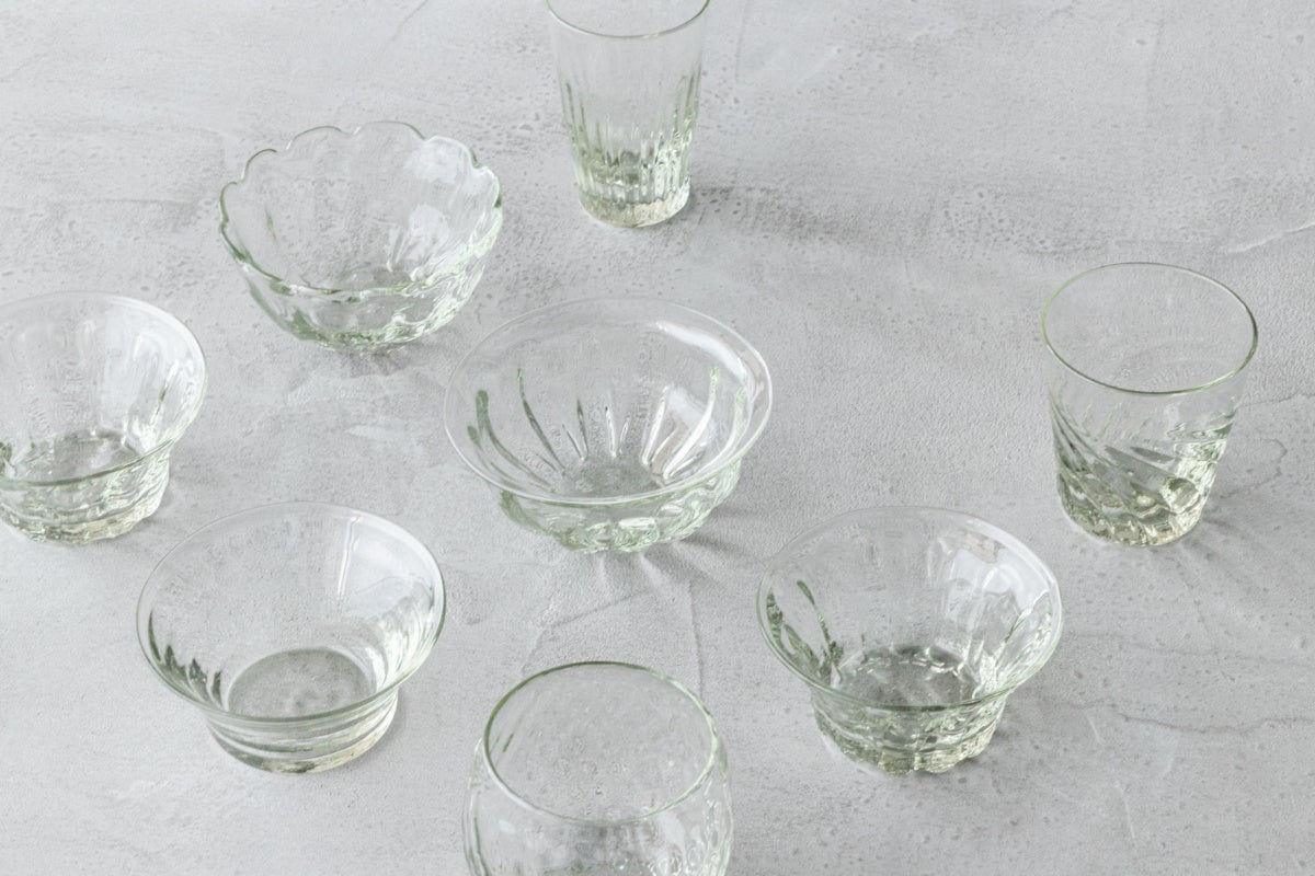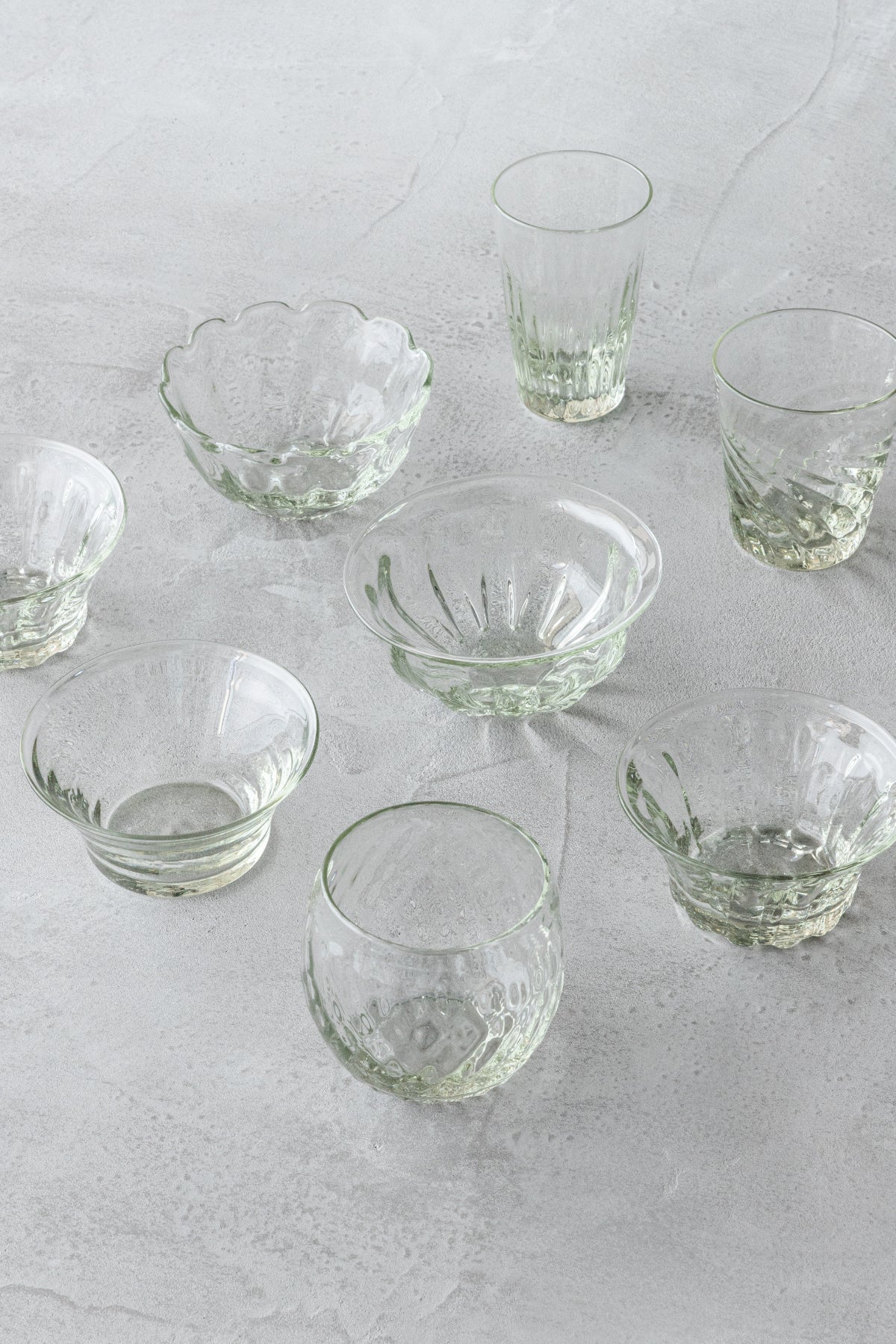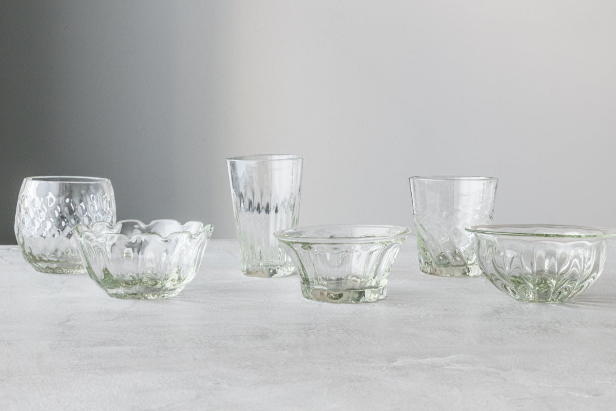 2022年8月に東京・浅草かっぱ橋道具街に店舗をオープン、日常を豊かにするガラス専門店としてガラスのコップを中心に、花器やガラスペンなど幅広い層のお客様にご購入いただいています。日頃、お客様から「グラスだけでなくお料理に使える食器が欲しい!」という声を多数いただいていました。TSUCHI-YA仕入れ担当者が、日常で使いやすく手に取りやすい食器を探す中、中村氏の作品に出会いました。再生ガラスとは思えないその透明感、微かなガラスの発色が美しく、丁寧なつくりにも惚れ込みました。小鉢やボウルは形の種類も豊富で、組み合わせを選ぶ楽しさがあることも、TSUCHI-YAがお取り扱いしたい魅力のひとつとなり、今回の企画展実施となりました。
