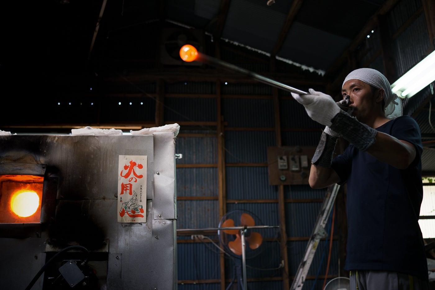 水飴状に溶けたガラスを吹き竿で巻き取り、 息を吹きこんで形を形成する吹きガラスで制作。炉内温度はおよそ1400℃。夏場は、50℃を超える工房で、真摯にガラスと向き合い、1日に出来るのは約25個。再生ガラスでの制作はコストがかかり、かつ原料ガラスと比べて、 倍くらい冷めるのが早く、制作は難しいとされます。それでも使用するのは、再生ガラス独特の風合い、透明感に加えて、深み、温かみを持った柔らかい雰囲気に惹かれていること、弟子入りした沖縄のガラス工房では泡盛の廃瓶を使っていたこともあり、その経験を活かし、制作を続けています。