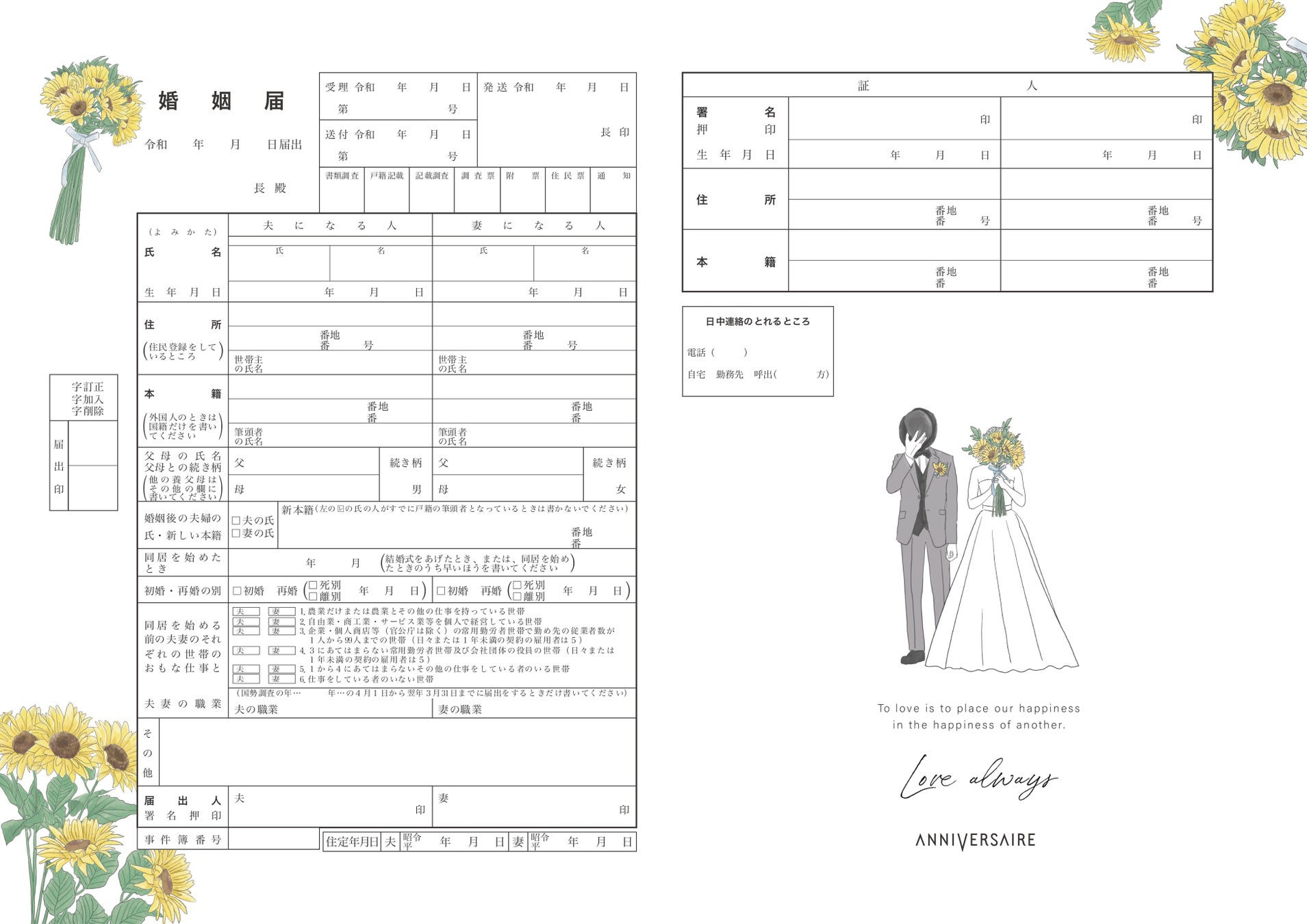 ひまわりをあしらった婚姻届です。太陽をイメージする明るい花のひまわり。帽子やブーケで顔を隠した茶目っ気のある新郎新婦のイラストが雰囲気にぴったりです。