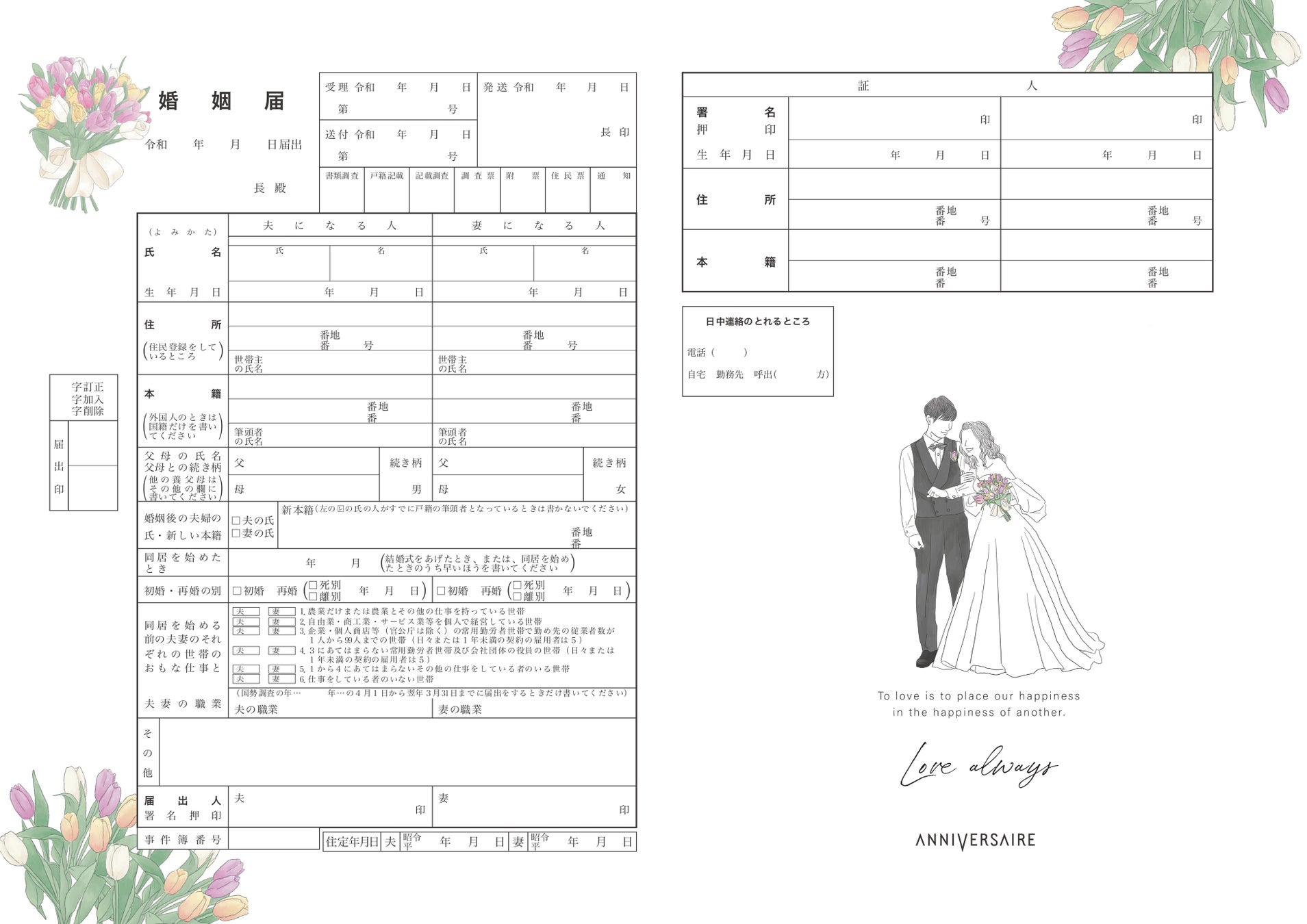 チューリップの花をあしらった婚姻届です。かわいらしいチューリップの花に合わせ、新郎新婦のイラストは和やかな雰囲気に仕上げました。