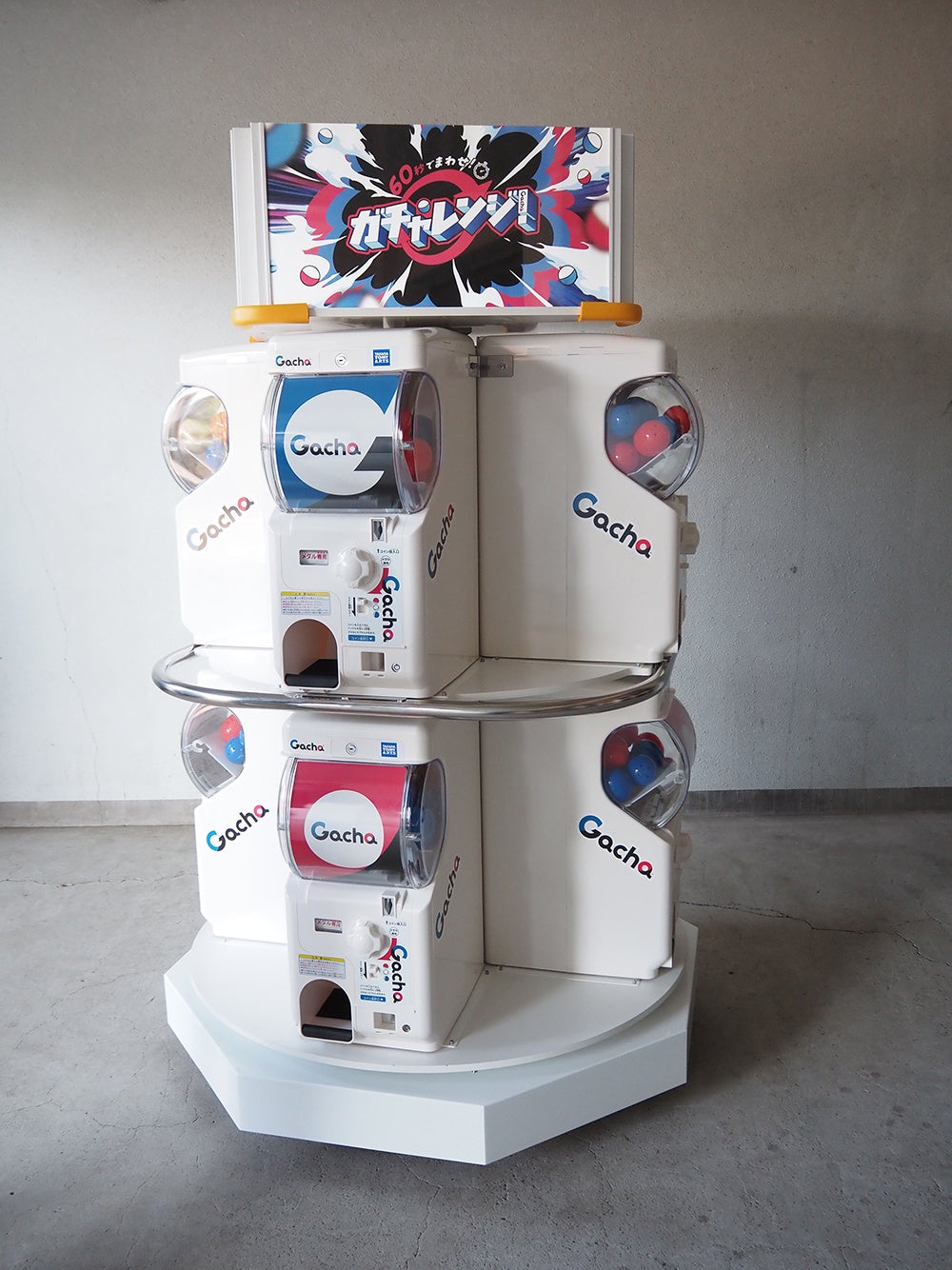 60周年にちなんで60秒間(1分間)ガチャを回し続け、出てきたカプセルの個数と色で得点を競うというゲームになります。 「ガチャレンジ!」は「ガチャツアー」の会場内の特設ステージで参加者を募って実施いたします。第1回は上述の「アリオ亀有」会場で、4月26日(土)・27日(日)に開催となります。