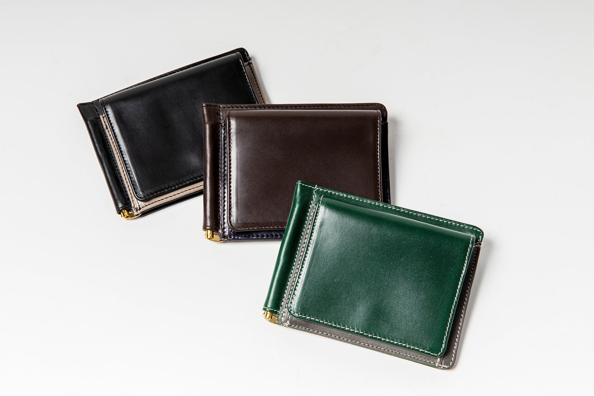 グレンロイヤルの代表的な革財布。マネークリップというクリップ単体で使用するお札留めをブライドルレザーで覆い、小銭入れも付属させた珍しいデザインとなっています。 カードポケットも多く、薄マチであることから実用的かつ軽快な使い心地で人気を博しています。