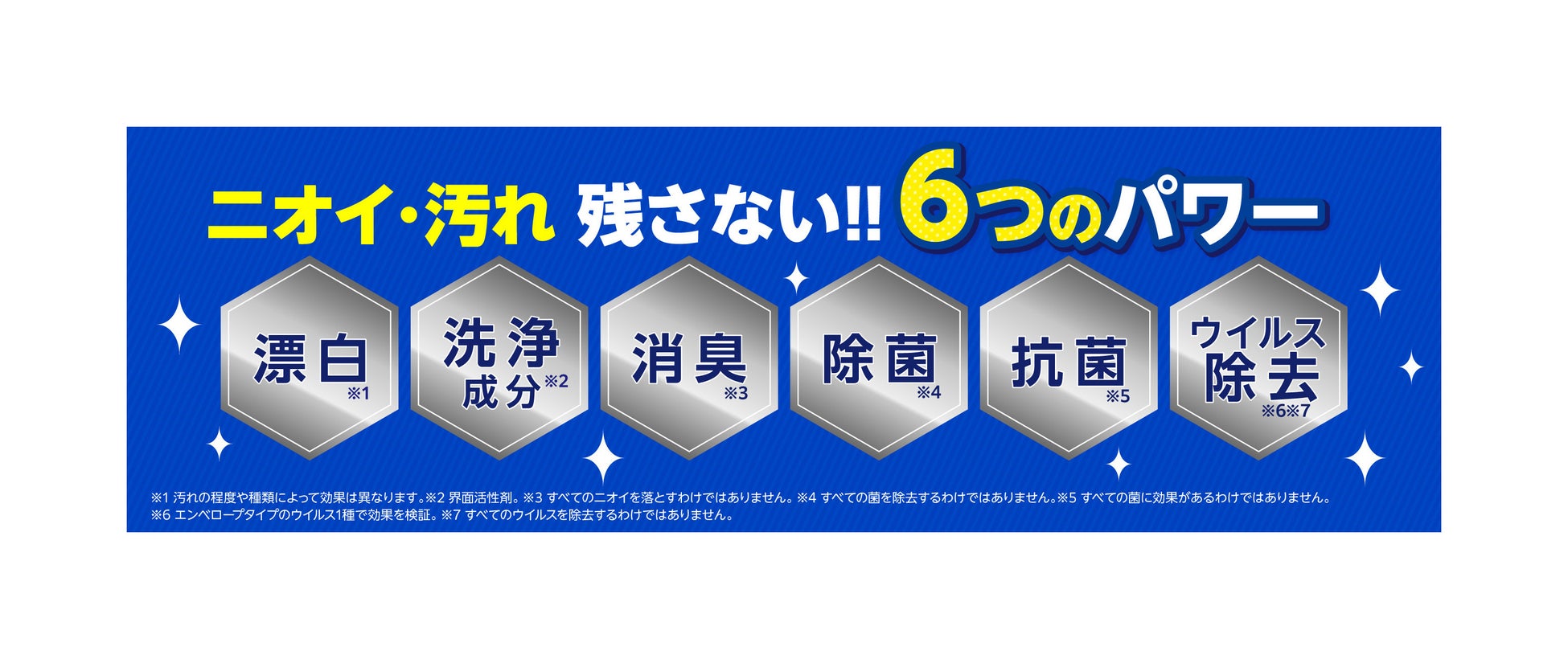 ※1 汚れの程度や種類によって効果は異なります。 ※2 すべてのニオイを落とすわけではありません。 ※3 布製品を漬けおきした場合 (すべての菌を除菌するわけではありません)。 ※4 すべての菌に効果があるわけではありません。 ※5 エンベロープタイプのウイルス1種で効果を検証。 すべてのウイルスを除去するわけではありません。