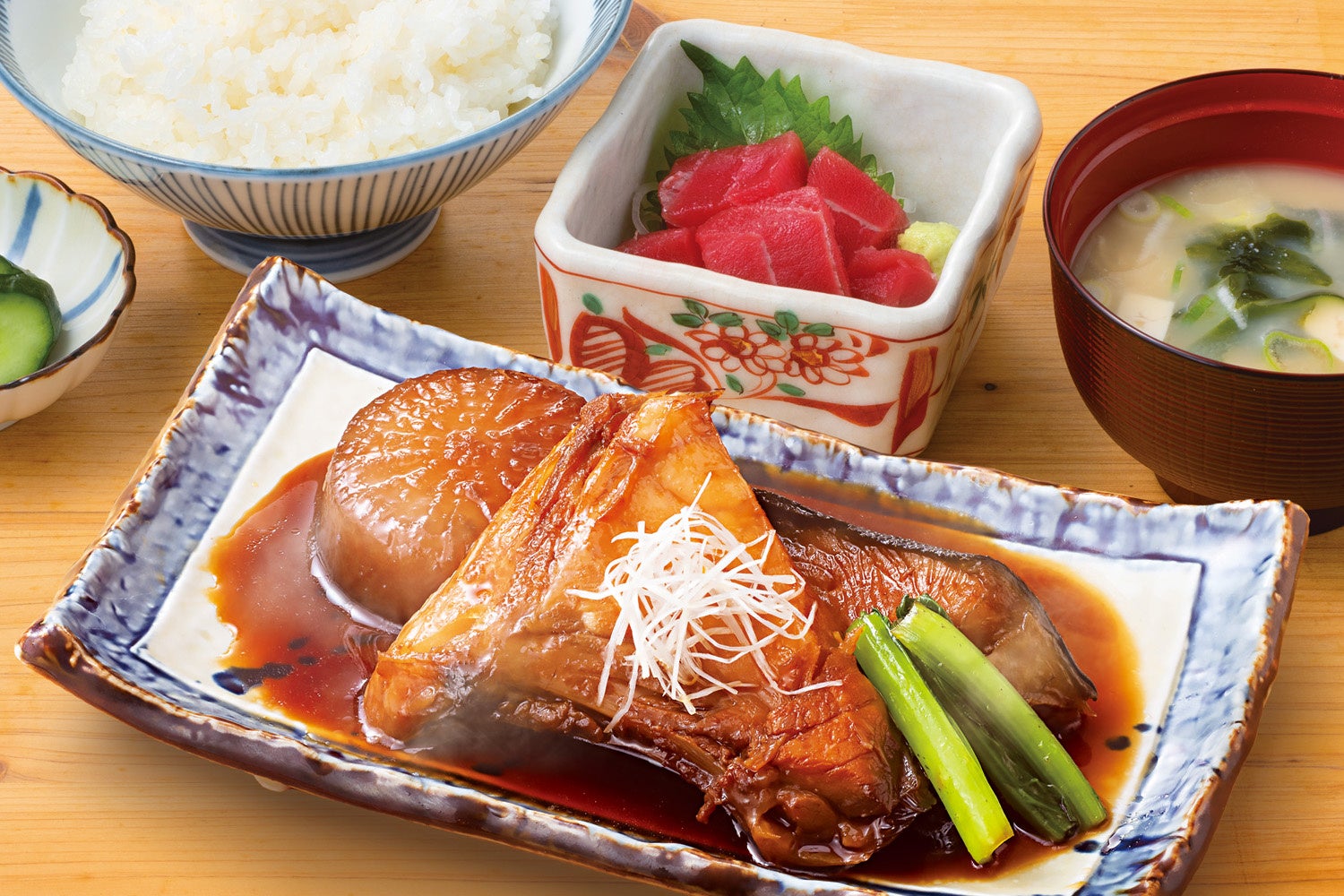 ランチタイムも、海鮮居酒屋らしいボリューム満点、食べ応えバツグンの男前メニューが勢ぞろい。マグロなどのゴロゴロぶつ切り刺身を酢飯の上に豪快にのせた「ぶつ切り刺身まかない丼」(通常1,280円→半額640円)や、鮮魚の刺身8種に塩辛がついた1日10食限定の「水産大漁刺身定食」(通常1,980円)。マグロぶつが付いた日替わりの煮魚、焼き魚定食(通常 各1,200円)といった、コストパフォーマンス抜群のメニューを揃えています。