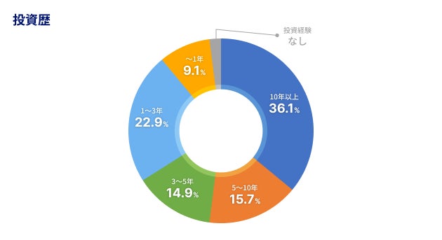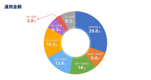 Wealth Wingの利用者のうち約99%が投資経験者。また、投資歴10年以上の方が最も多く約36%、現在の運用総額も1,500万円以上の方が約30%と最も多い。
