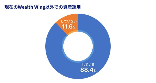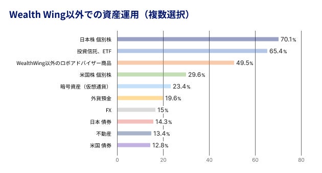 Wealth Wingの利用者のうち約88%はWealth Wing以外でも資産運用を行っている。そのうち運用している金融商品のトップ3は、1位:日本株 個別株(約70%)2位:投資信託、ETF(約65%)、3位:Wealth Wing以外のロボアドバイザー商品(約50%)