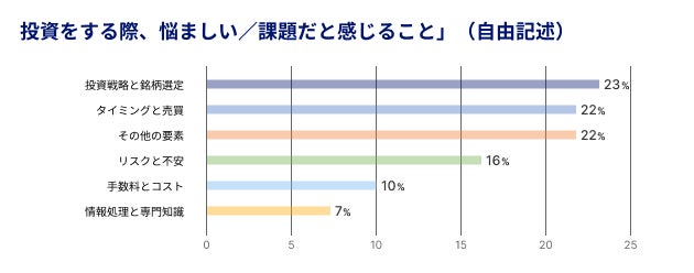 投資をする際、悩ましい/課題だと感じることの自由記述では、「投資戦略・銘柄選定」「タイミングと売買」と回答する方が多かった(※)
