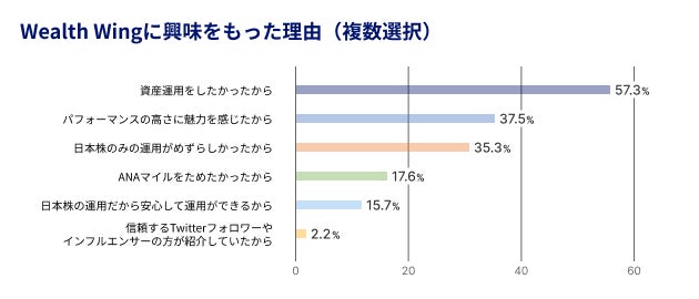 Wealth Wingに興味をもった理由では、1位:「資産運用をしたかったから」(約57%)2位:「パフォーマンスの高さに魅力を感じたから」(約38%)、3位:「日本株のみの運用がめずらしかったから」(約35%)