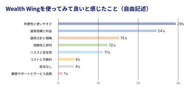◼︎Wealth Wingを利用して良かったことの自由記述では、「利便性と使いやすさ」「運用成績と利益」「運用方針と戦略」と回答する方が多かった(※1)
