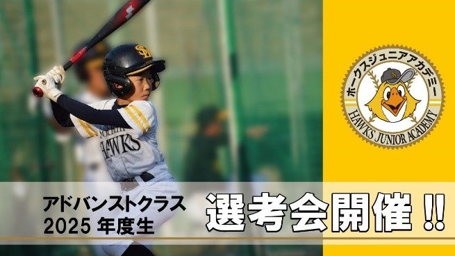 ホークスジュニアアカデミー ベースボールスクールでは、2025年1月25日(土)に新小学5年生・6年生を対象にしたジュニア最上級クラス「アドバンストクラス」2025年度生の選考会を開催いたします。