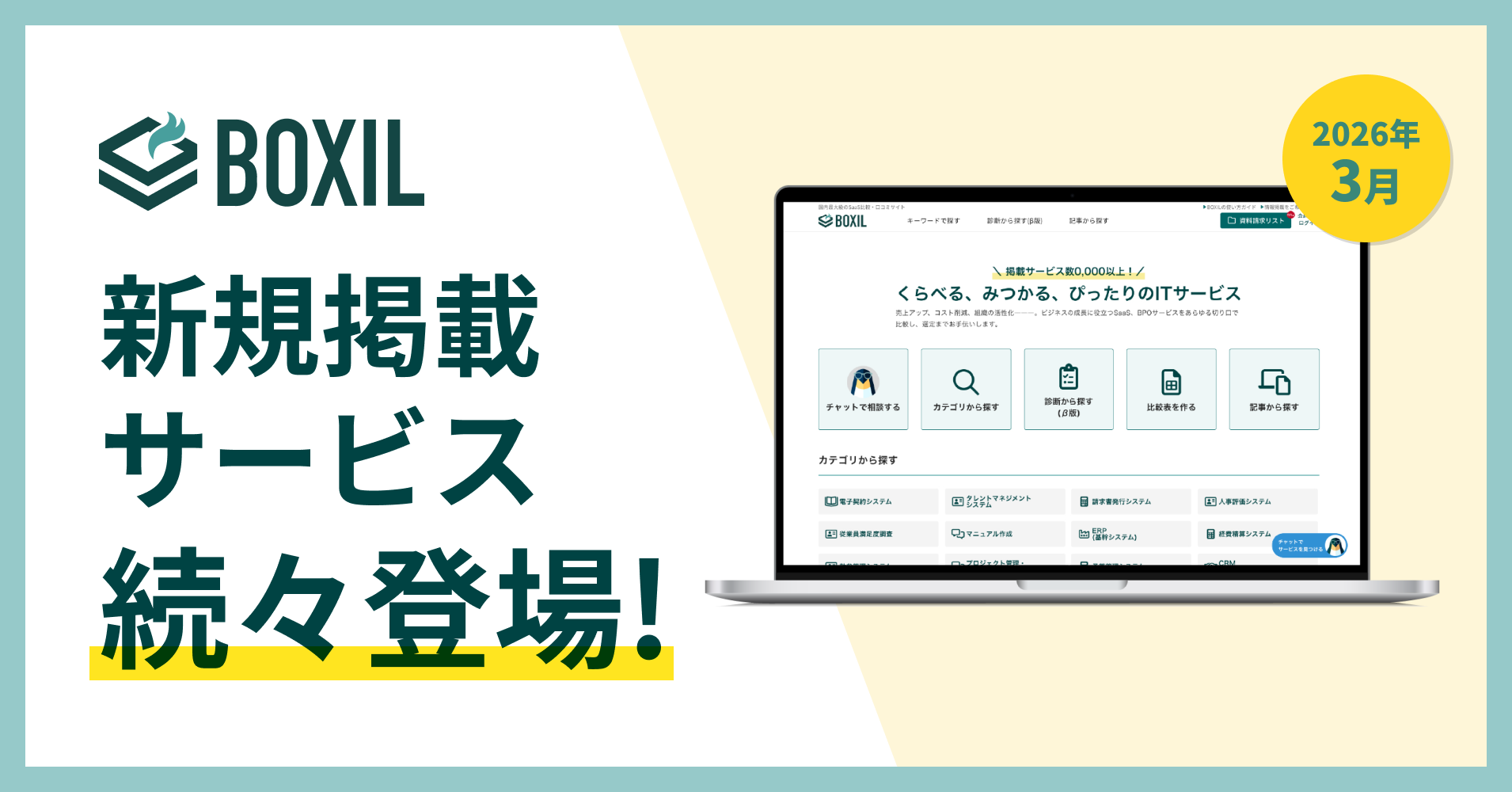SaaS比較サイト「BOXIL」が2026年3月度新規掲載サービスを発表