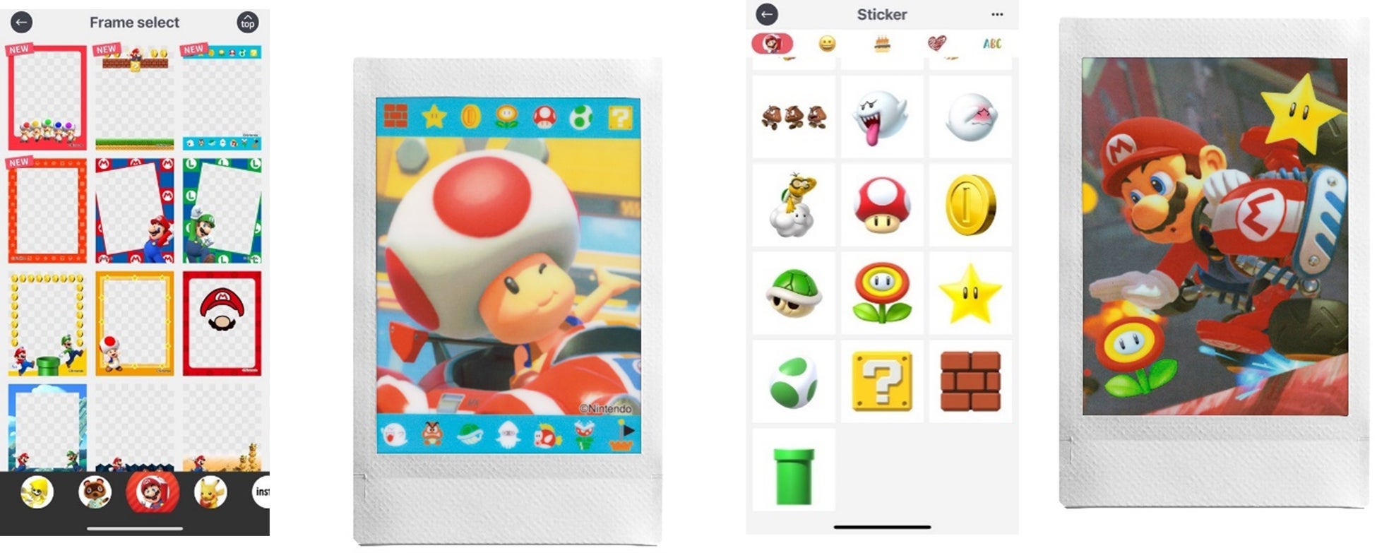 新しいデザインの「スーパーマリオ」のフレームとステッカーが登場。多彩なキャラクターのフレーム(147点)やステッカー(167点)を、撮影したゲーム画像やお気に入りの画像と組み合わせることで特別なチェキプリント™を作り上げます。