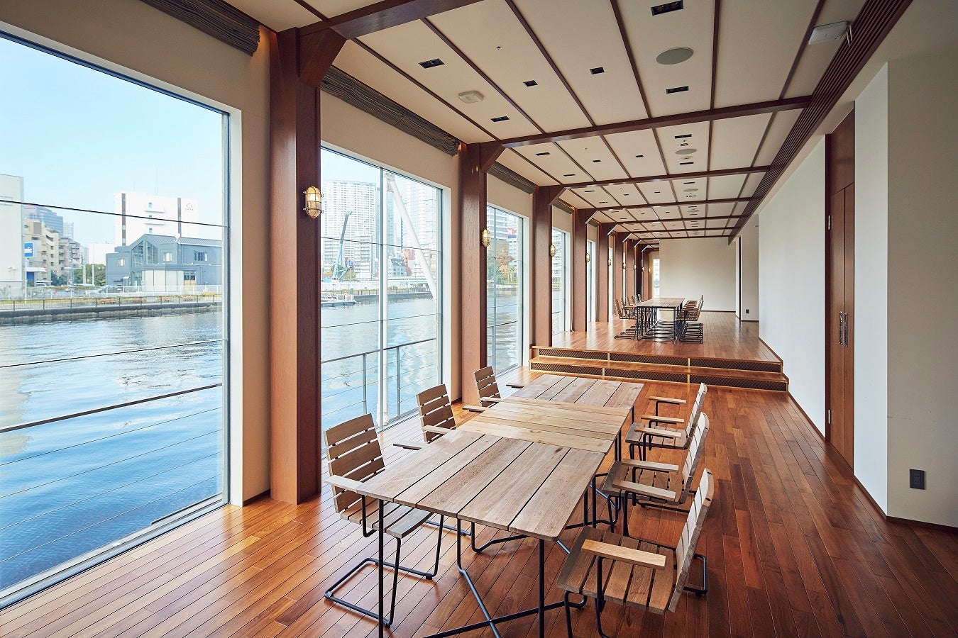 日本を代表する建築家・隈研吾氏監修の天王洲運河に浮かぶ船上スペースです。ローデッキ・メインデッキ・ルーフトップの3層で構成され、最大170名の収容が可能です。運河からの風と水面の光に包まれ、都心であることを忘れてしまうような、唯一無二の空間です。大切な方をお招きするパーティーや、他社とは一線を画す最先端のイベントなど、特別な瞬間でのご利用に好評をいただいております。