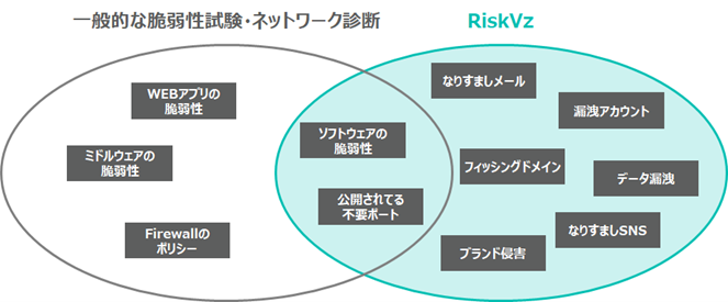 「RiskVz」は、企業のIT・セキュリティ担当者が管理を行うソフトウェアの脆弱性や不要ポート*2だけでなく見落としている・把握していないIT資産に対して、外部から脅威になりえるリスクを可視化するサービスです。