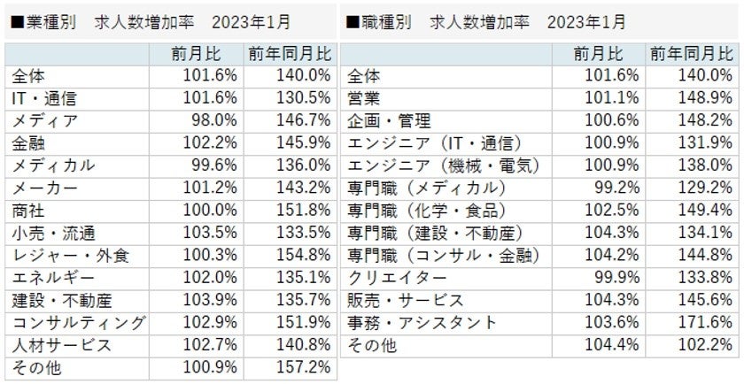 2023年1月の転職求人倍率は、前月から-0.21ポイントの2.34倍となりました。求人数は前月比101.6%、前年同月比140.0%となりました。転職希望者数は前月比110.7%、前年同月比115.8%でした。