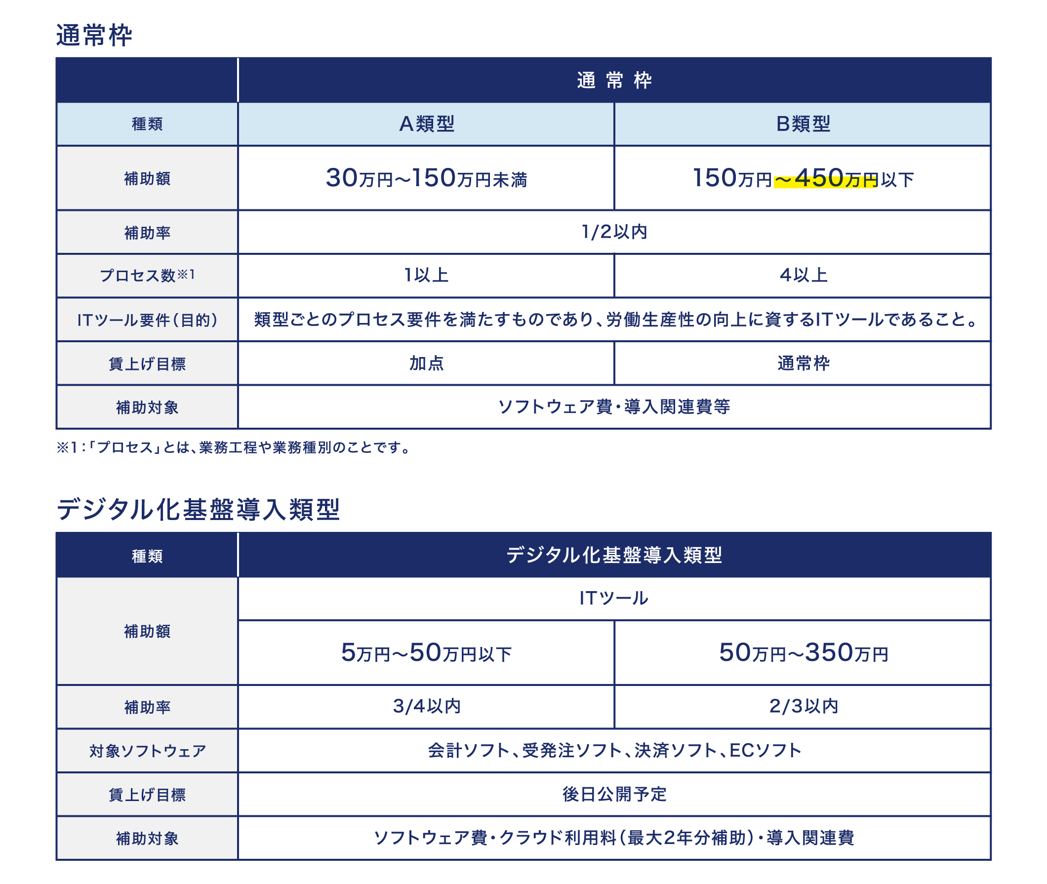 「IT導入補助金2022」は、2022年の4月から申請受付開始が予想されますが、Wizでは下記ツールの申請を予定しております。補助率は通常枠で最大1/2、450万円、新設のデジタル化基盤導入類型では最大3/4、最大350万円の補助金の交付を受けることが可能です。