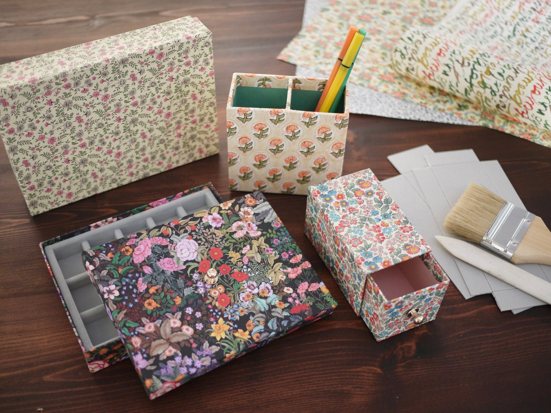 イタリア,アメリカなどの海外デザインペーパーの中からお好きな柄を選んで作る,箱作りのワークショップです。