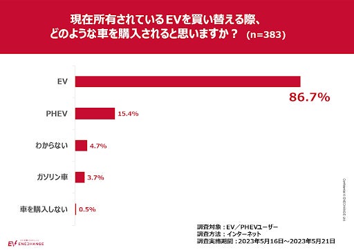 EVユーザーのうち、車を買い替える際に次も「EVを選ぶ」と回答したのは、全体の約9割(87%)という結果になりました。