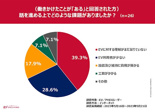 また、今までEV充電設備を導入するために働きかけたことが「ある」と回答したEVユーザーの内約4割が、集合住宅へのEV充電器設置に向けた課題として「EVに対する理解が足りていない」ことを挙げました。実際に働きかけた結果、「管理会社からの承認が得られなかった」、「門前払いだった」、「EV所有者が少なく理解が得られなかった」という理由で、基礎充電の設備が整わないという現状があるようです。特に集合住宅においては、補助金などの金銭面の支援に加え、「EVやEV充電設備とはどういったものなのか」理解を広めていくことが必要であると分かります。