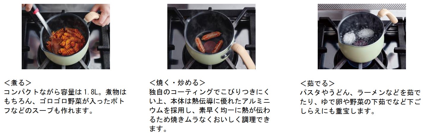 煮る・焼く・炒める・茹でる・炊く・揚げる・沸かすなど、あらゆる調理法と用途に使用できます。容量1.8Lとコンパクトだから、1〜2人分の調理に役立ち、お味噌汁などの汁物、お弁当のおかず作りや朝食、軽食作りにも便利です。
