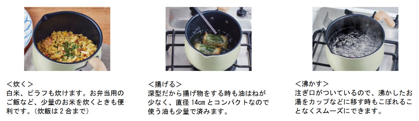 2022年の発売以来、人気を集める「オプティスペース IHステンレス マルチポット 16cm」は、煮る・焼く・炒める・茹でる・炊く・揚げる・沸かすなど1台で何役もこなす優秀なキッチンアイテム。この度発売の「オプティスペース マルチポット 14cm」は、直径14cm、容量1.8L(満水時)とコンパクトになり、扱いやすさ、使い勝手がさらにアップしました。直径14cmのミニマムなサイズながら多様な料理に対応するため、1〜2人分の調理に役立ちます。スープやお味噌汁などの汁物、お弁当のおかず作りや朝食、軽食作り、ハーブティの煮出しやココア、ラテなどのホットドリンク作りまで、様々なシーンで活躍します。