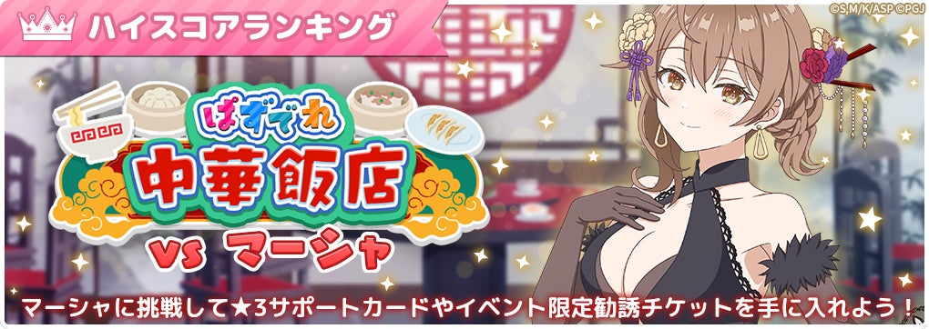 本日5月3日(土)よりイベント「ぱずでれ中華飯店VSマーシャ」を開催します。当イベントは、期間中のハイスコア順位に応じたランキング報酬が獲得可能です。またイベントで集めたポイントで、イベント限定のサポートカードやアイテムが獲得できる交換所も登場。繰り返し挑戦してよりたくさんのポイントを集め☆3サポートカードや勧誘チケットを手に入れよう!