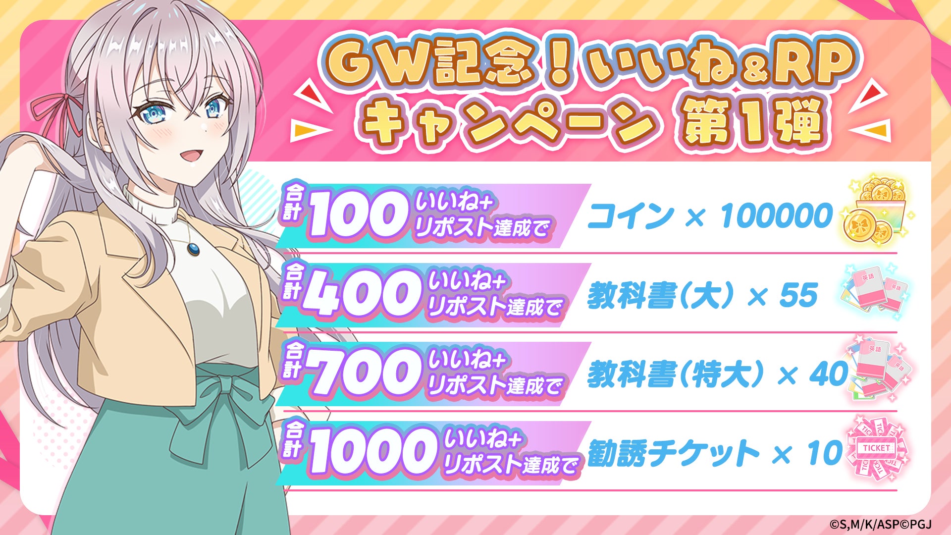 公式Xでは5月1日(木)より「GW記念 第1弾 いいね&RPキャンペーン」を開催します。本キャンペーンは、該当投稿の「いいね」と「リポスト」の合計数を達成したら『ぱずでれ』を遊んでいるプレイヤーに豪華アイテムをプレゼント!