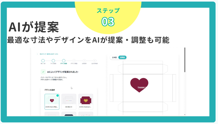 「My PUP」に実装されたAIエージェントは、ユーザーの用途やイメージをもとに、適したパッケージ形状やサイズ、デザイン候補を提案する仕組みです。