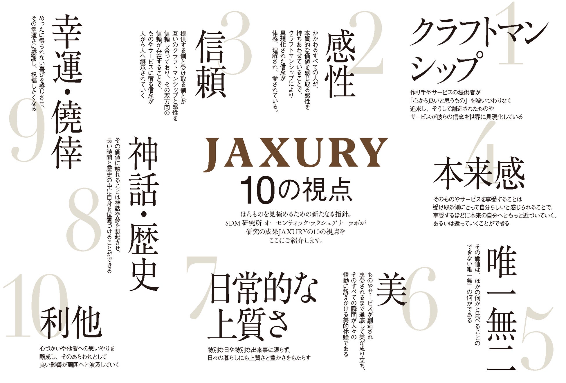 JAXURY(ジャクシュアリー)とは、株式会社講談社による“ほんもの”で“心地よい”「もの・こと・サービス」を通して、日本発の価値を発信することで、新時代に求められる“感動体験”を届ける、産学メディアプロジェクト≪Japan’s Authentic Luxury(JAXURY)≫による取り組み支援・事業共創をいいます。