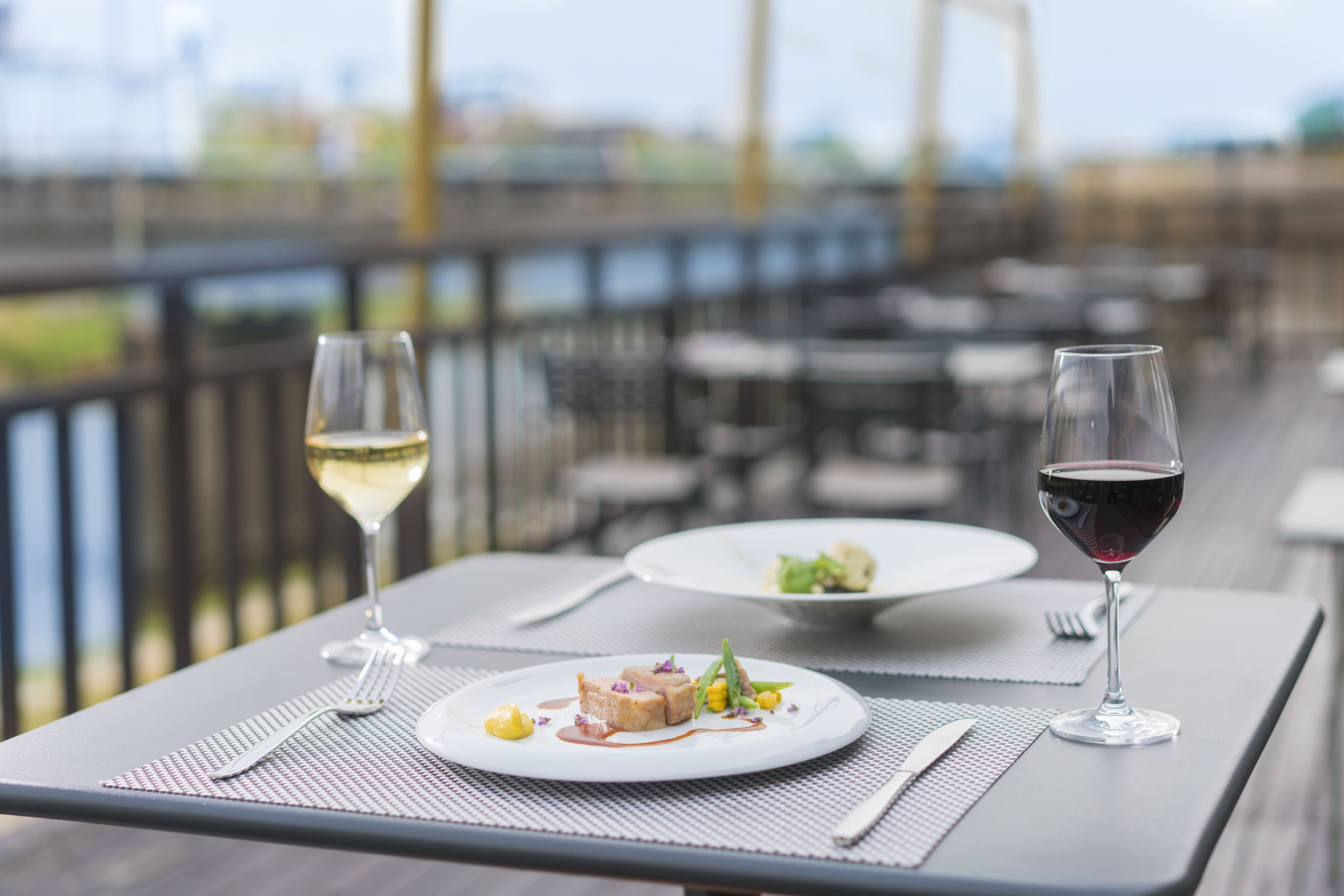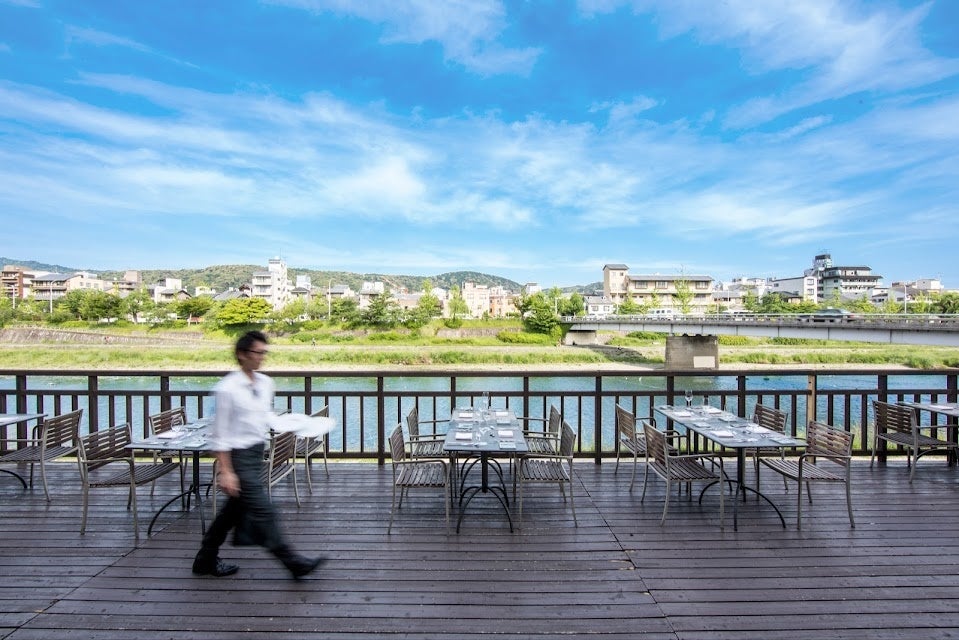 そんな鮒鶴京都鴨川リゾートでは、毎年5月から9月の期間限定で川床を開放しています。川床は京都では夏の風物詩として知られ、鮒鶴京都鴨川リゾートの川床は鴨川沿い最大規模の床面積を誇ります。目の前を流れる鴨川と遠くの東山の眺望からは、京都の四季がありありと伝わり、京都らしい夏を感じながらフレンチ料理をお愉しみいただけます。