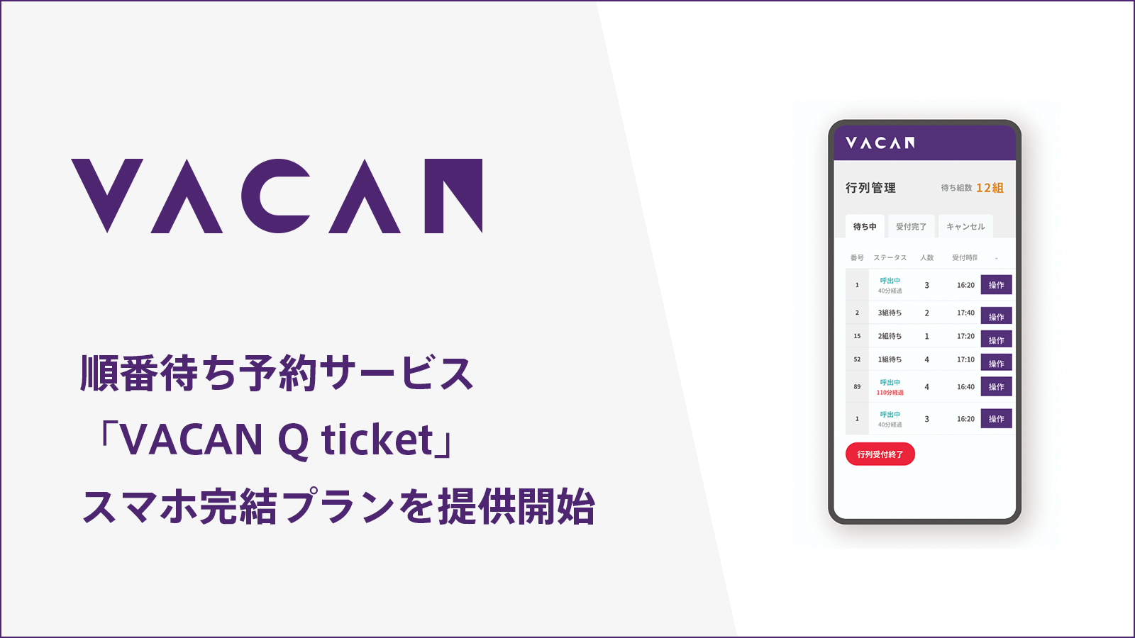 スマホ1つで、利用者の快適性向上を実現!順番待ち予約サービス「VACAN Q ticket」 スマホ完結プランを提供開始