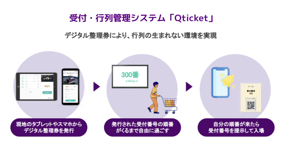 Q ticketは、設置場所のタブレットを操作したり、専用ページにアクセスするなどしてデジタル整理券を発券し、その場に並ばずに順番待ちができるようにするサービスです。メールアドレスやLINE等を登録することで、順番が近づいたらスマートフォンで通知を受け取ることができ、待っている時間を自由に過ごしていただくことができます。利用者の待つストレスや、待ちによる「混雑」の発生抑制をサポートします。