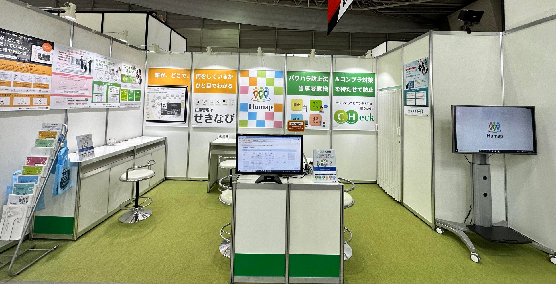 Humapのブースでは、在席管理ツール「せきなび」や ハラスメント&コンプラ調査「CHeck」のアンケート画面などを 実際にご覧いただけるデモ機をご用意。