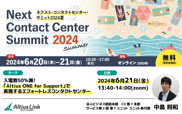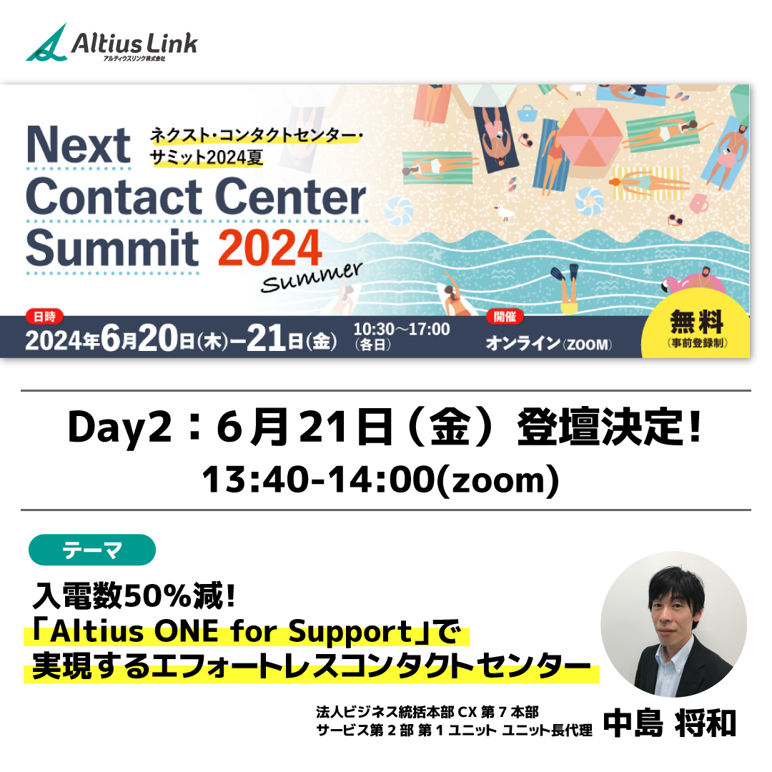 6月21日(金)「ネクスト・コンタクトセンター・サミット2024夏」に登壇「入電数50%減!『Altius ONE for Support』で実現するエフォートレスコンタクトセンター」