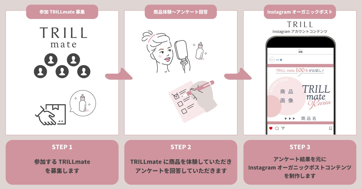 100名以上のTRILLmateに商品を体験していただき、レビューアンケートを実施します。その回答を集計し満足度調査のコンテンツとしてTRILLのInstagramアカウントで発信するプランです。19.2万人のフォロワーを持つTRILLInstagramアカウントで、商品について発信することができるメニューです。