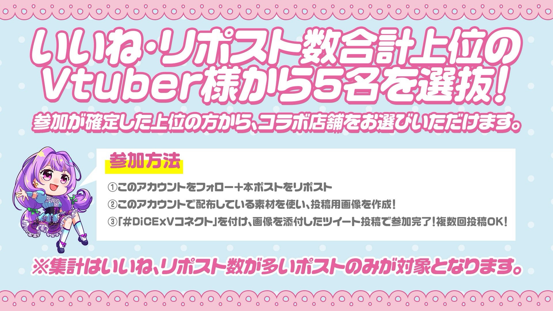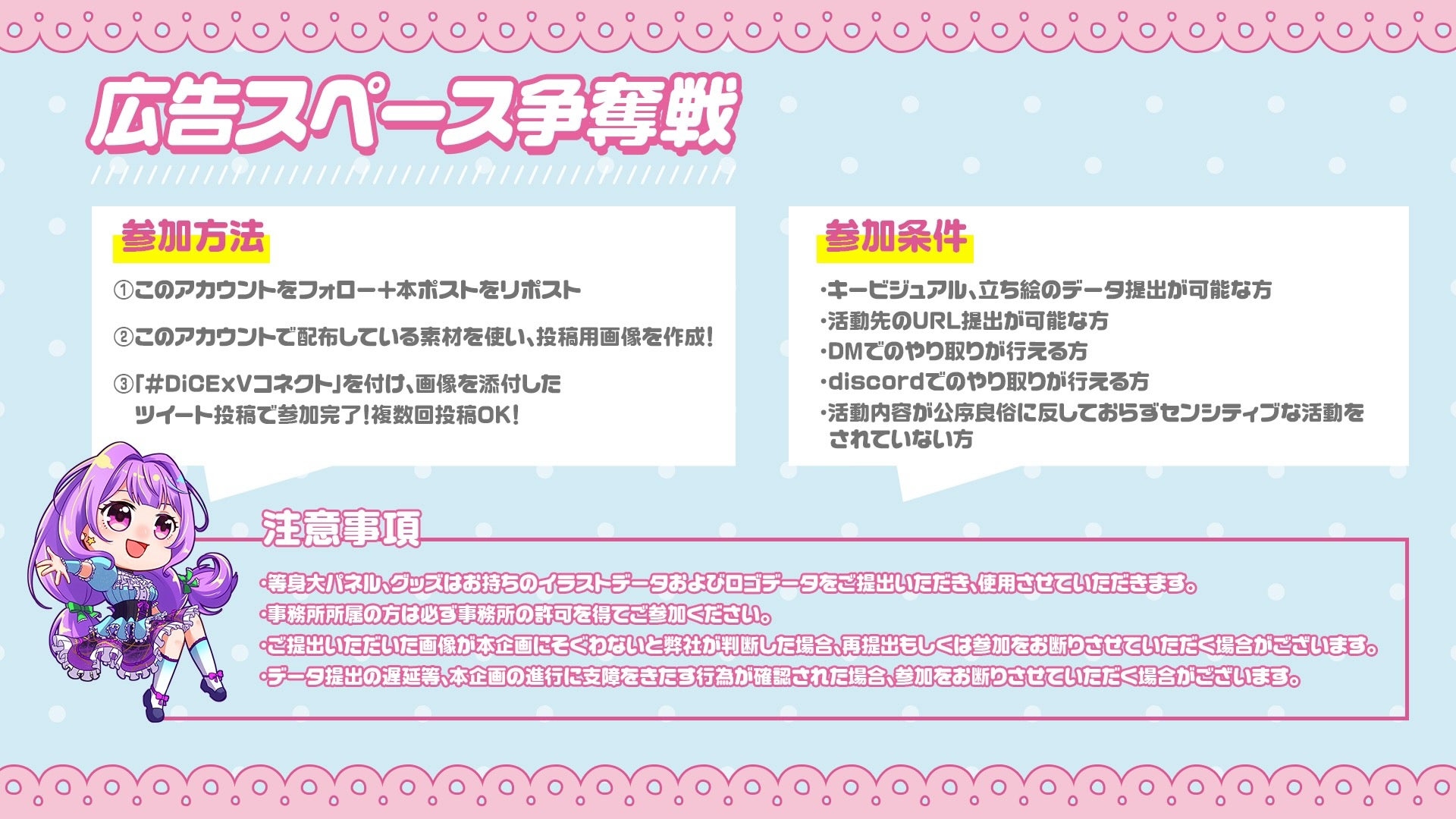 参加されるVTuberの『イベント参加表明ポスト』のいいねやリポスト数の上位5名の方にDiCEの広告スペースを進呈いたします。