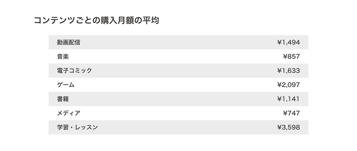 最も高い平均購入額は「学習・レッスン」で約3,600円、次いで「ゲーム」の約2,100円、「電子コミック」の約1,600円となっています。各コンテンツの単価や購入頻度にもよりますが、サブスクリプションとダウンロード購入のような購入方法による金額への影響も考えられます。