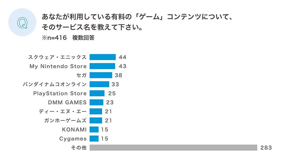 「スクウェア・エニックス」(約11%)、「My Nintendo Store」(約10%)、「セガ」(約9%)が上位に並んでいます。利用者はサービス名よりもゲームタイトルで選んでいると思われるため、時期やトレンドによって入れ替わることも多い分野と考えられます。