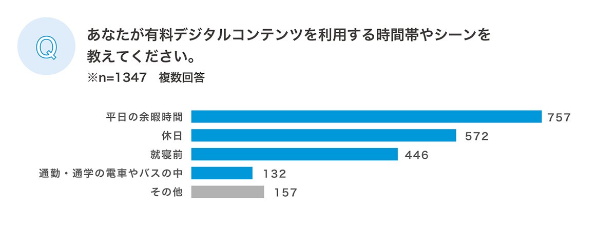 デジタルコンテンツを利用するのは「平日の余暇時間」や「休日」が主流となっています。「通勤・通学の電車やバスの中」で利用する人も少数派ですがいるようです。
