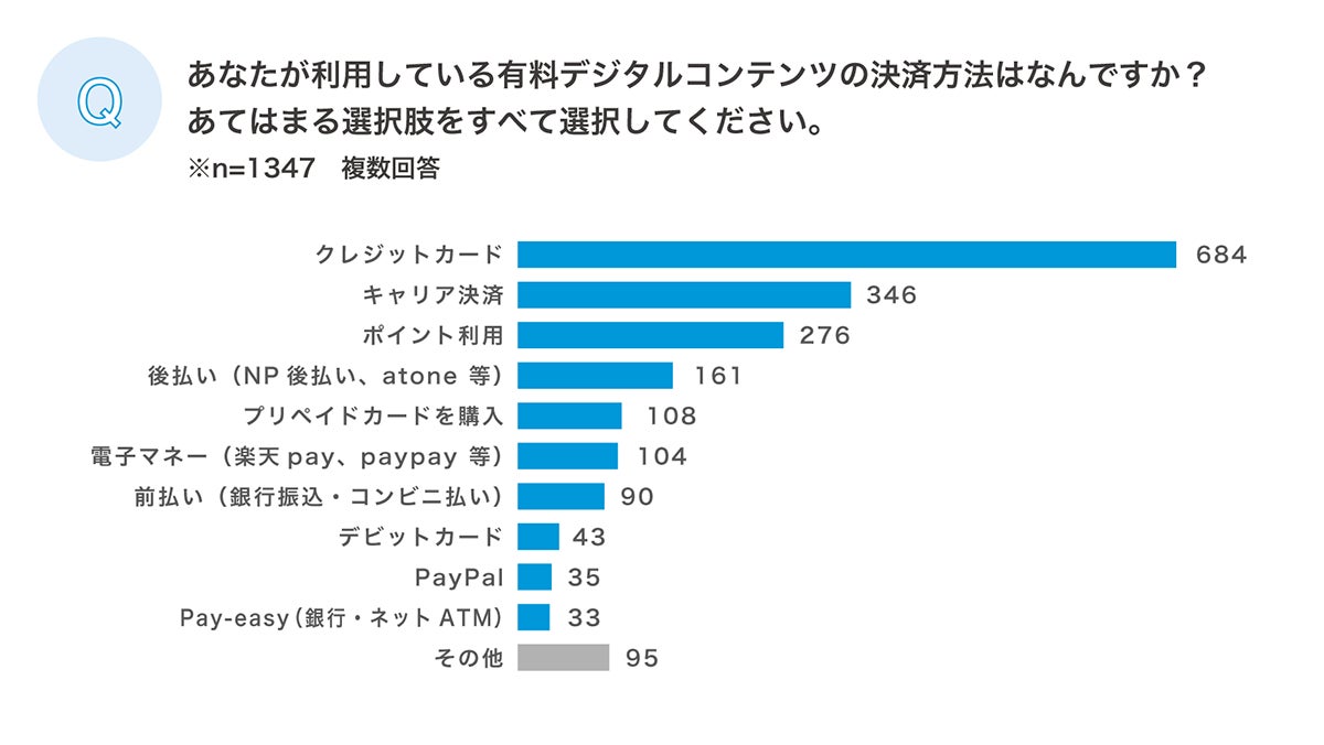 できれば使いたい決済方法として「クレジットカード」に次いで「後払い」が2位に選ばれていることから、有料デジタルコンテンツ市場における後払い決済へのニーズの高さが伺えます。